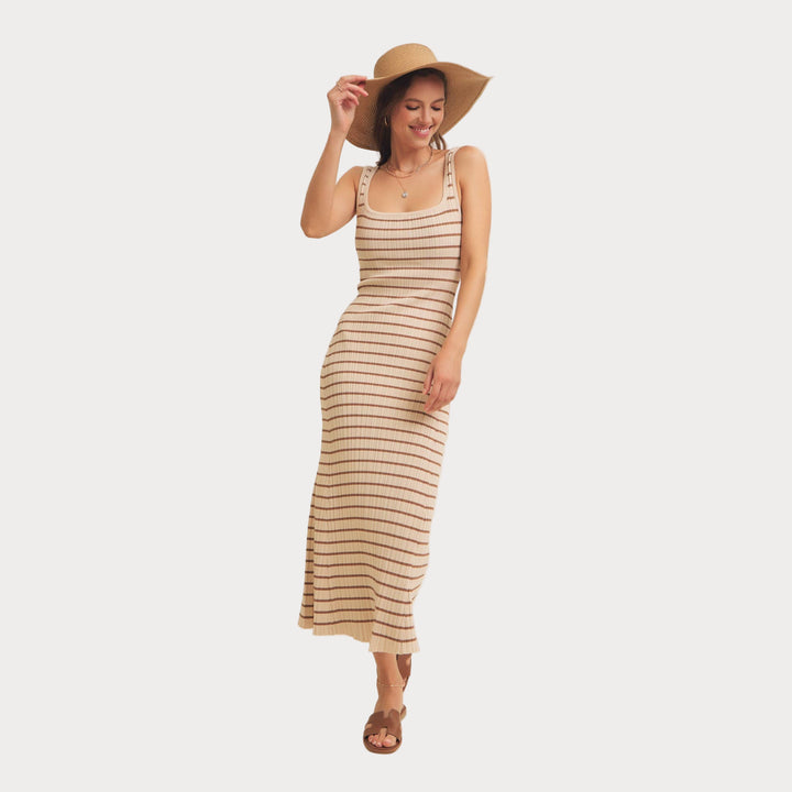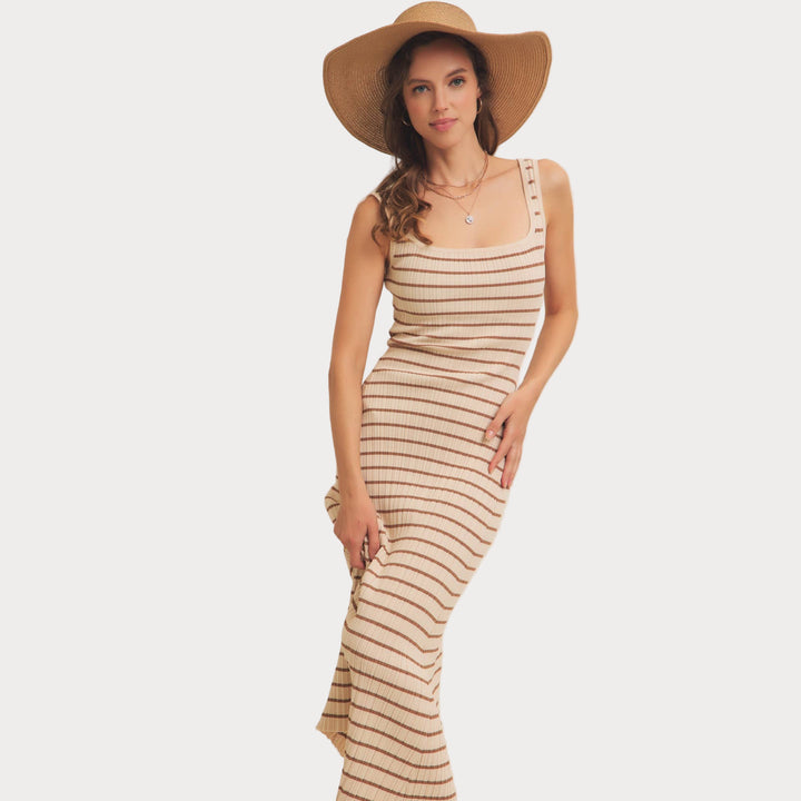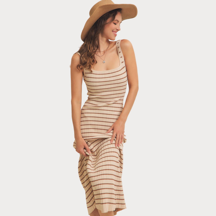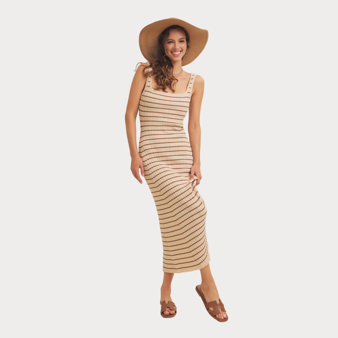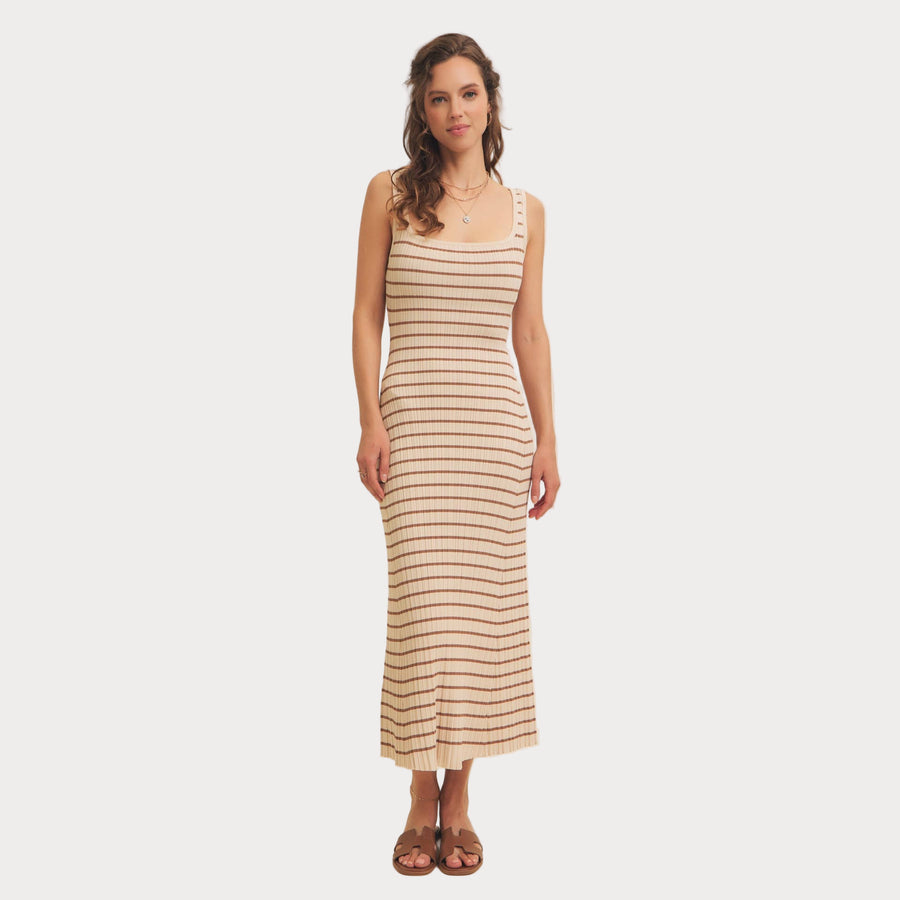 Striped Ribbed Knit Dress | Cream & Brown Midi Sweater Dress
