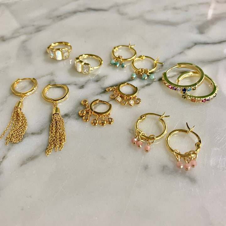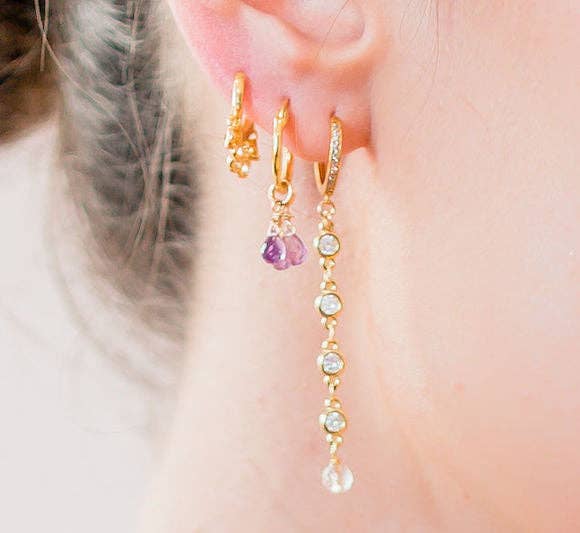 Fun and dainty, wear our Florence huggies on their own or stacked with others. Cubic Zirconia accents, 18k gold plated sterling silver, nickel-free. 1/4" diameter