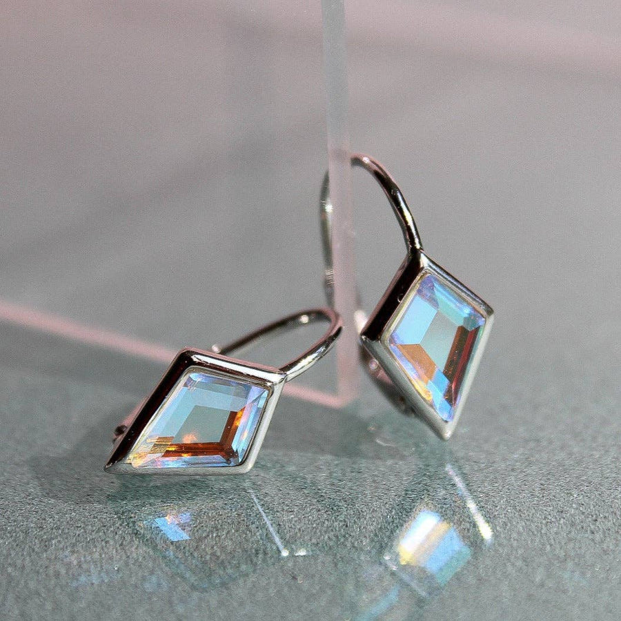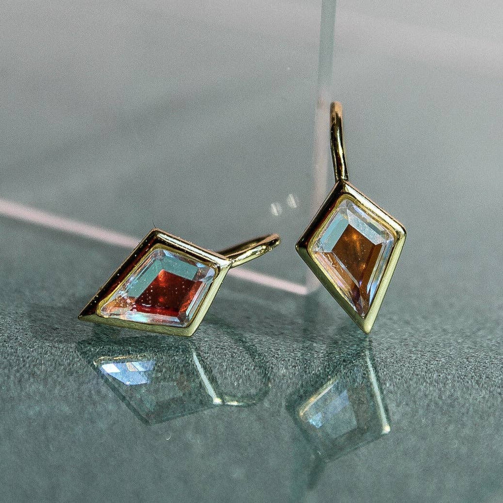 Elevate your style with the Kite Leverback Earrings in Angel Aura Quartz. Featuring a stunning iridescent, bold Kite cut stone, these earrings add a unique touch to any outfit.