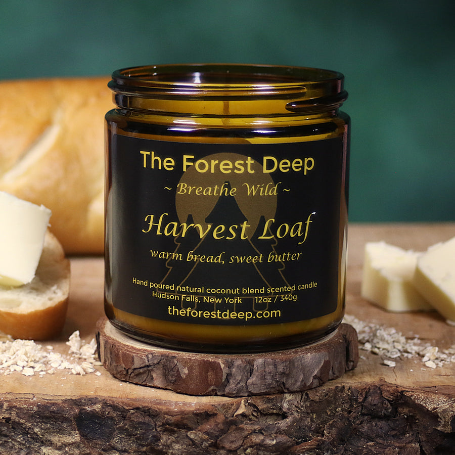Jar of 'Harvest Loaf' candle from 'The Forest Deep' on a wooden surface with bread and butter.