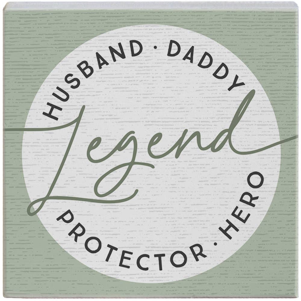 Celebrate dad with our Husband Daddy Legend Small Talk Square sign! Handmade in Rock Rapids, Iowa, this adorable block sign packs a punch with its fun quote, vibrant colors, and playful design. Show him he's not just a husband and daddy, but also a protector, hero, and overall legend.