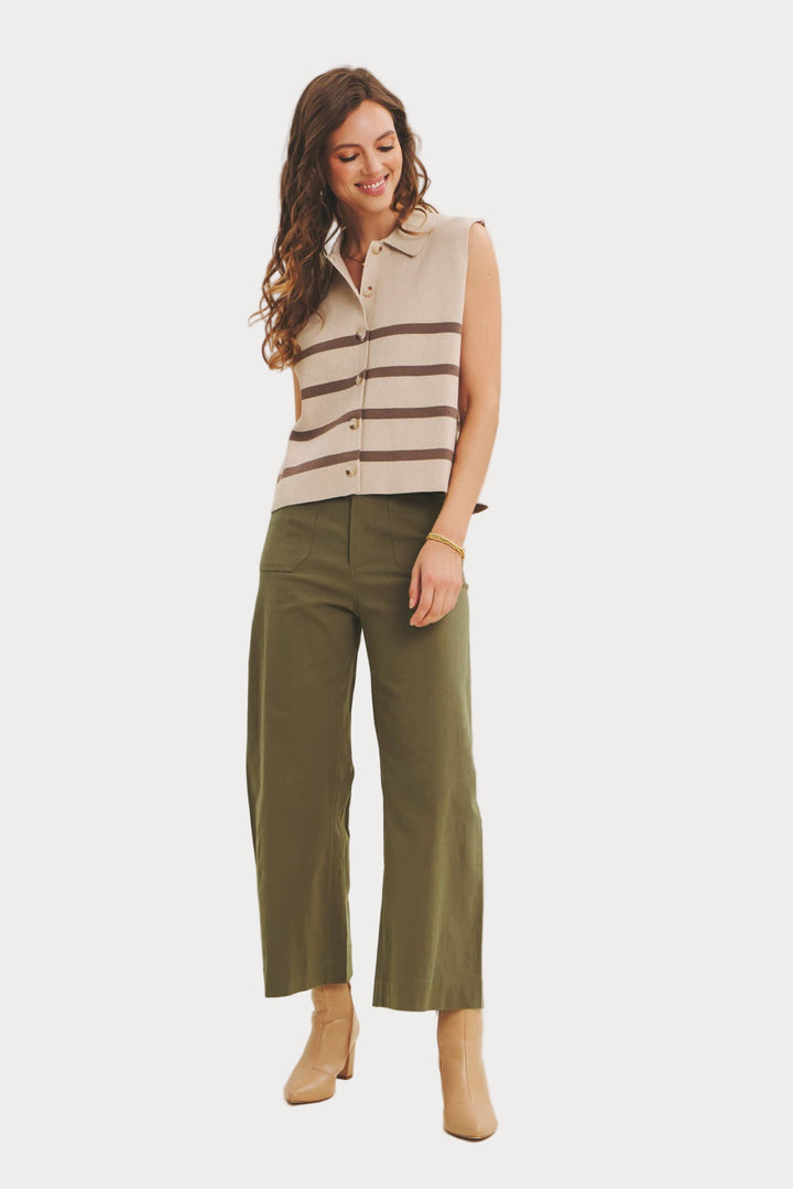 Woman wearing a striped sweater and wide-leg pants on a white background