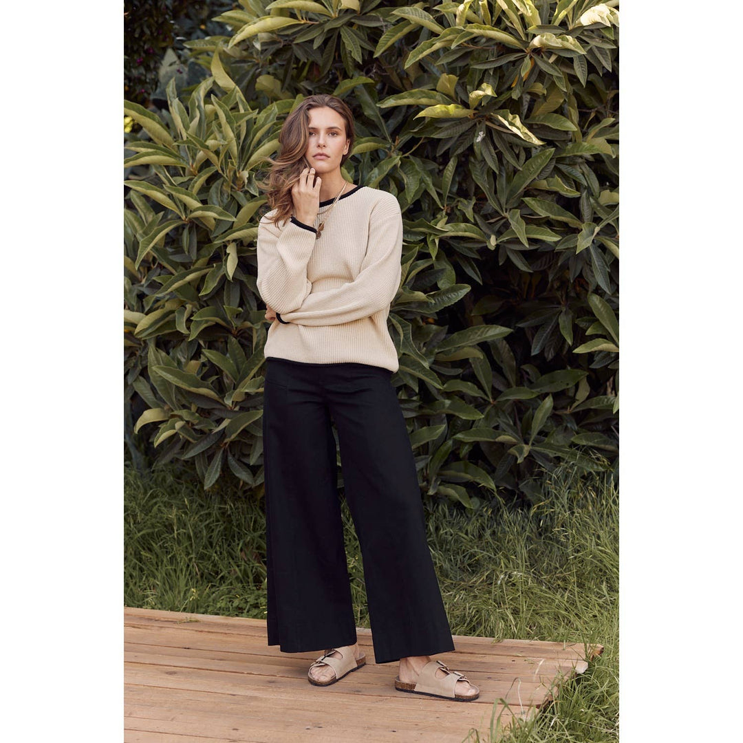 Woman wearing a beige and ivory contrast sleeve sweater with striped sleeves, styled casually with trousers.