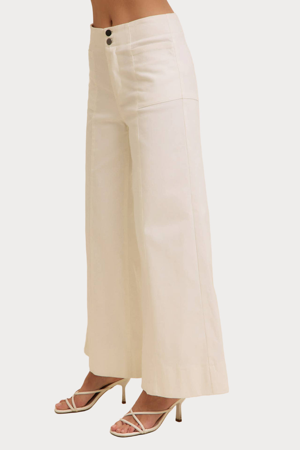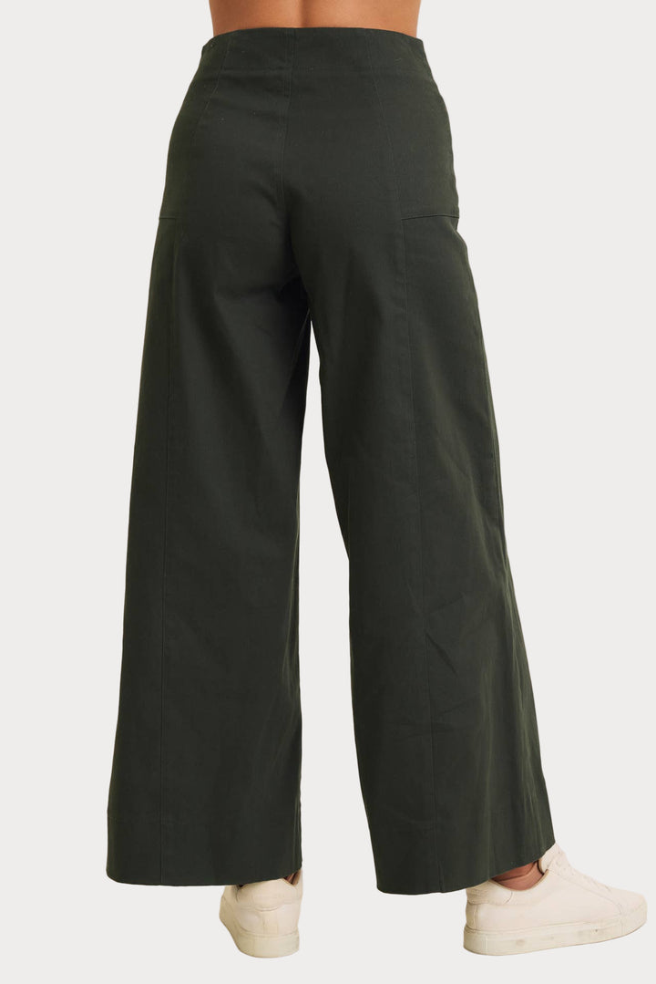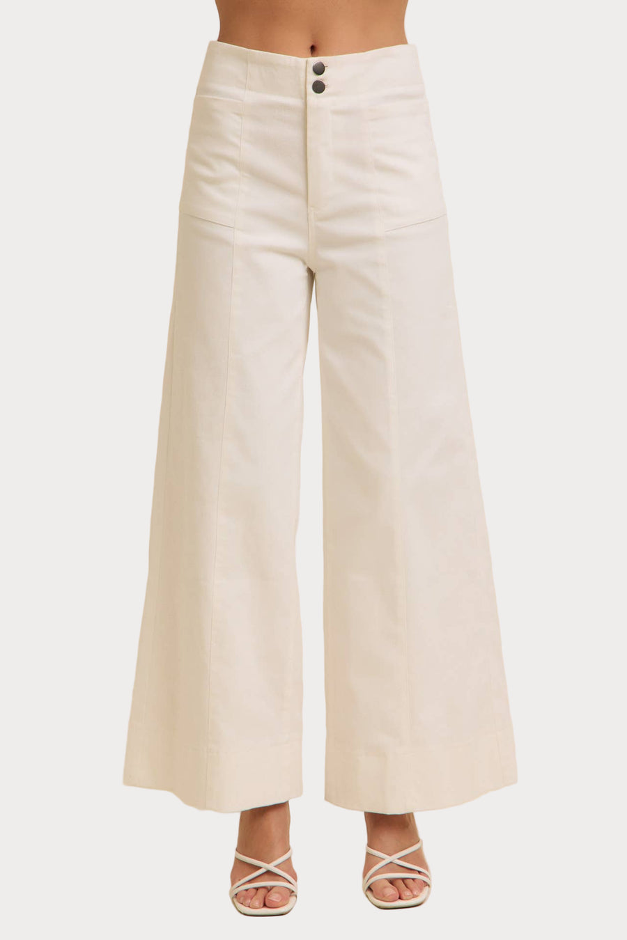Introducing our Flattering Wide Leg Full-Length Stretchy Pants, style A1402P. Designed to turn heads, these pants feature a chic two front button closure and convenient pockets, combining fashion with functionality. Crafted from a soft blend of 97% cotton and 3% spandex, they provide comfort and ease of movement. The model stands at 5'8" and wears a size SMALL; check our size chart for your perfect fit. Elevate your wardrobe with these essential pants.