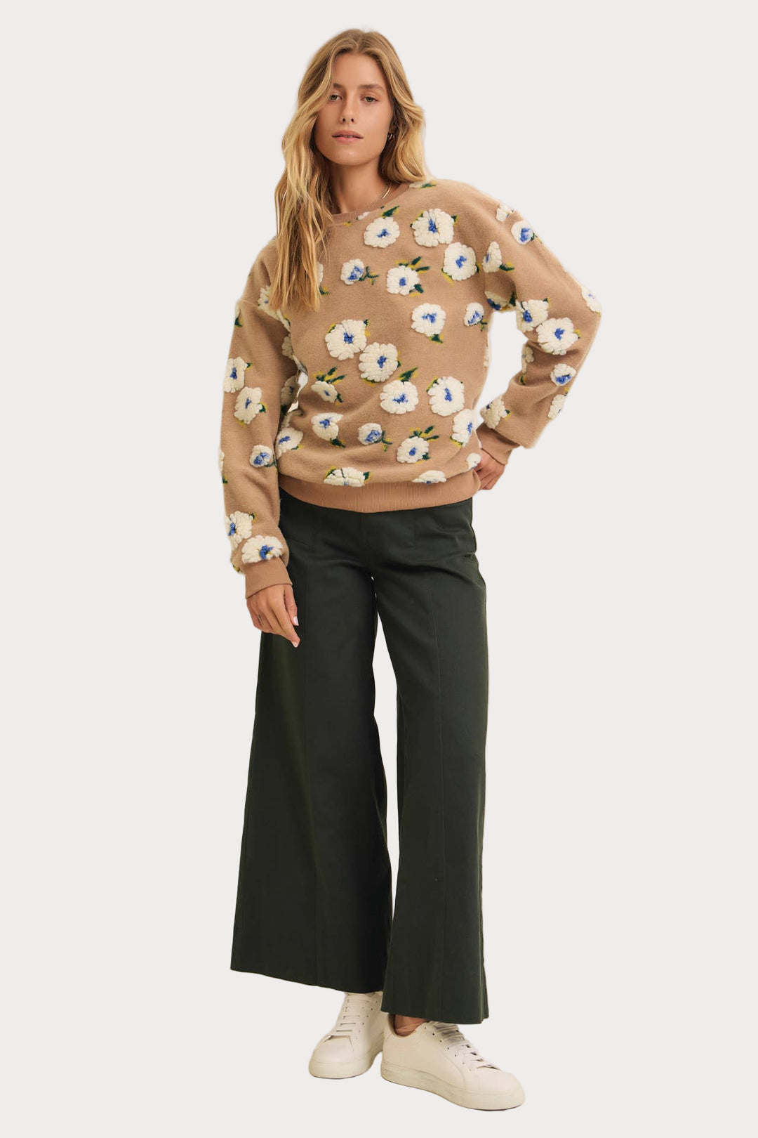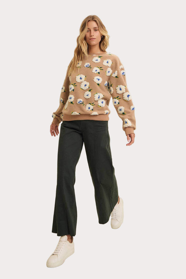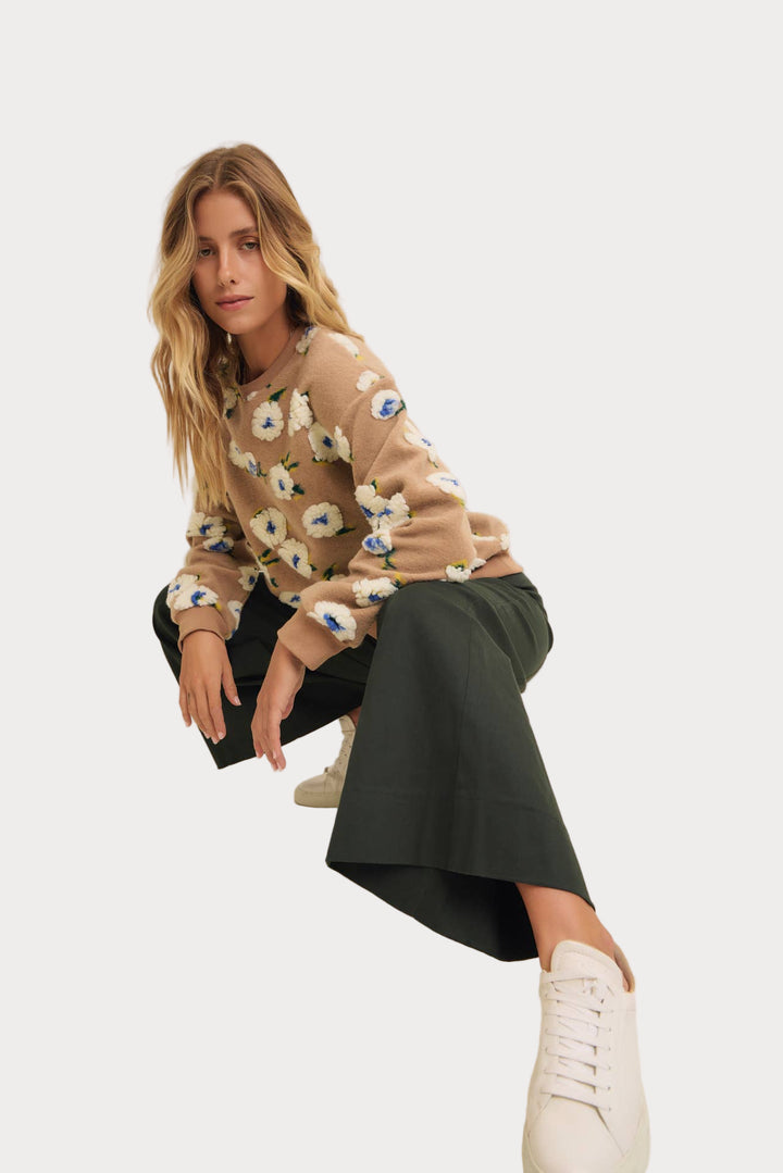 Woman wearing a leopard print knit sweater in neutral tones with ribbed cuffs and hem, styled in a cozy chic look.