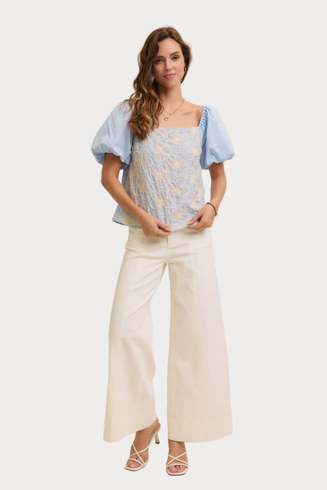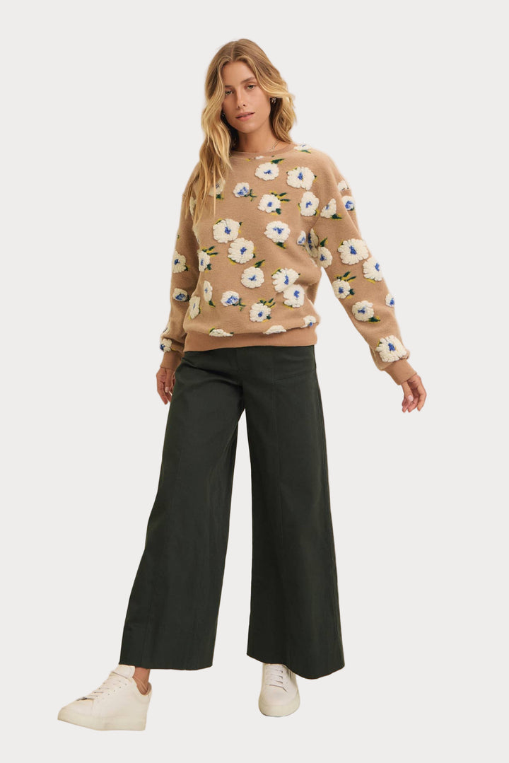 Woman wearing a black floral blouse and gray wide-leg pants on a beige background