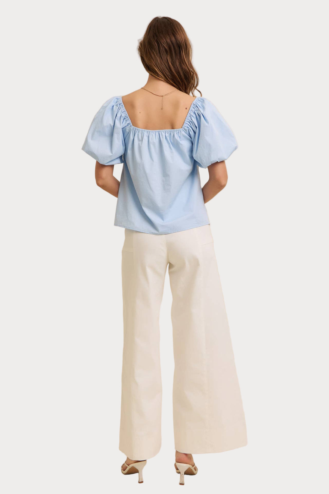 Woman wearing a blue side-tie sweater vest with V-neckline, styled with white pants.