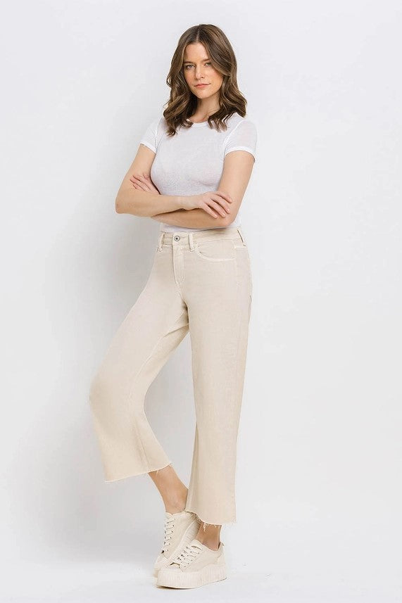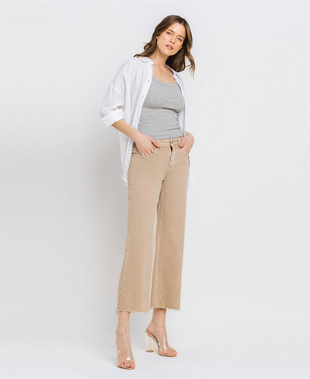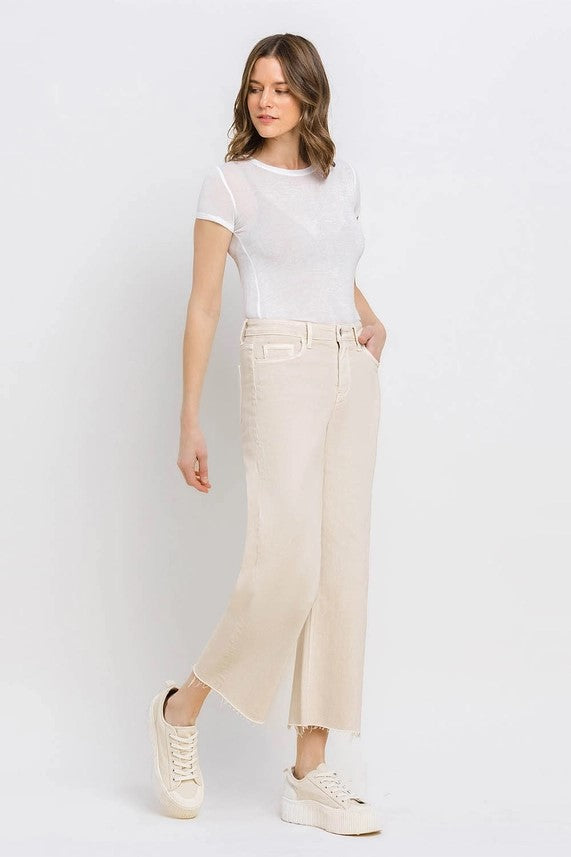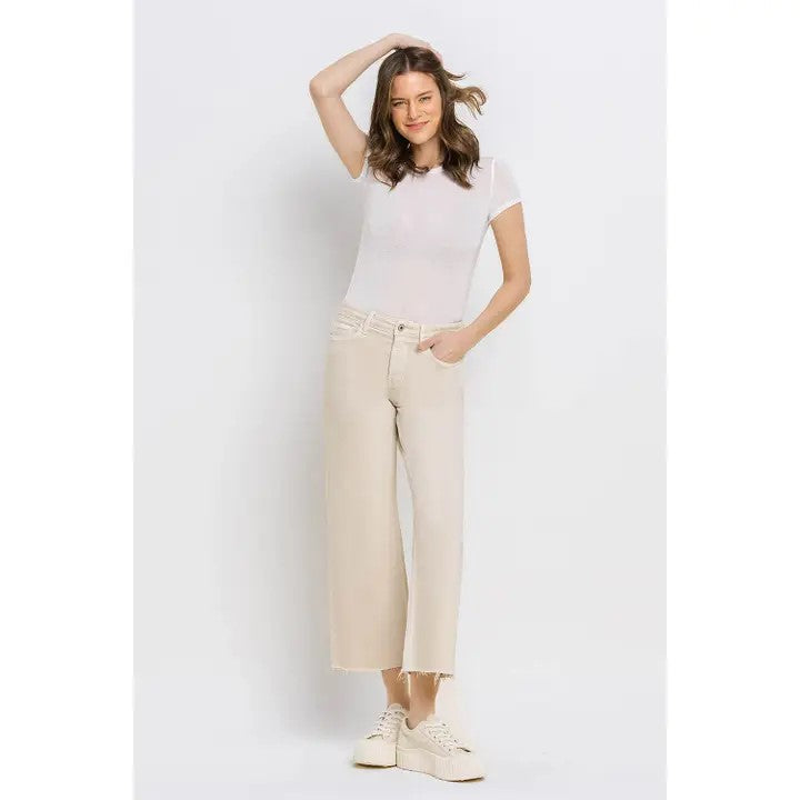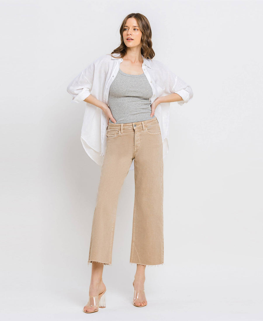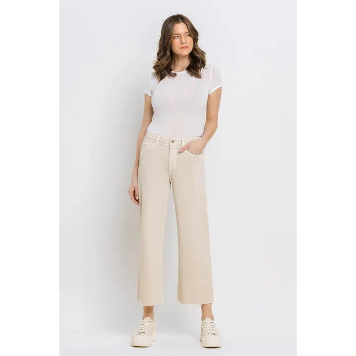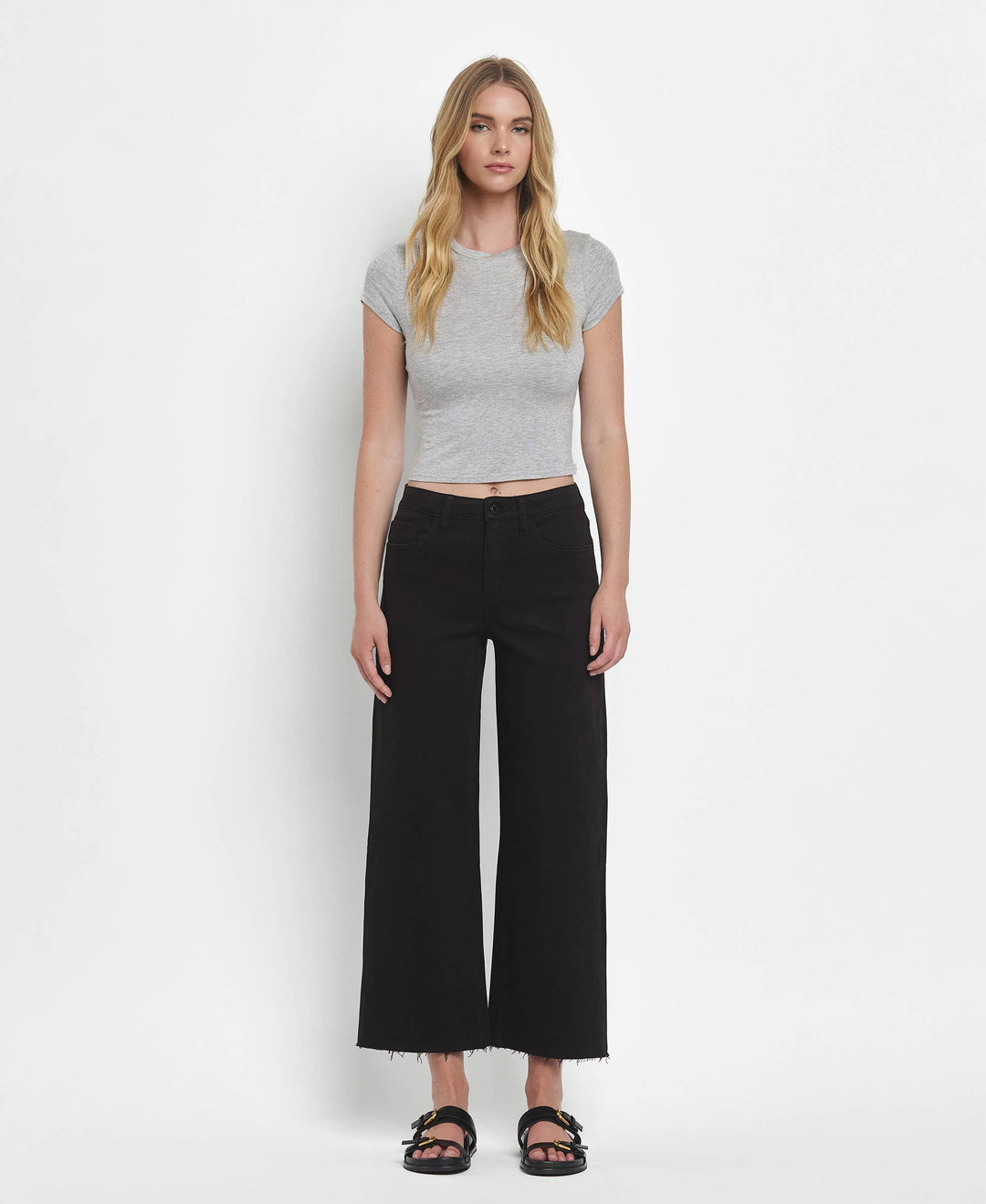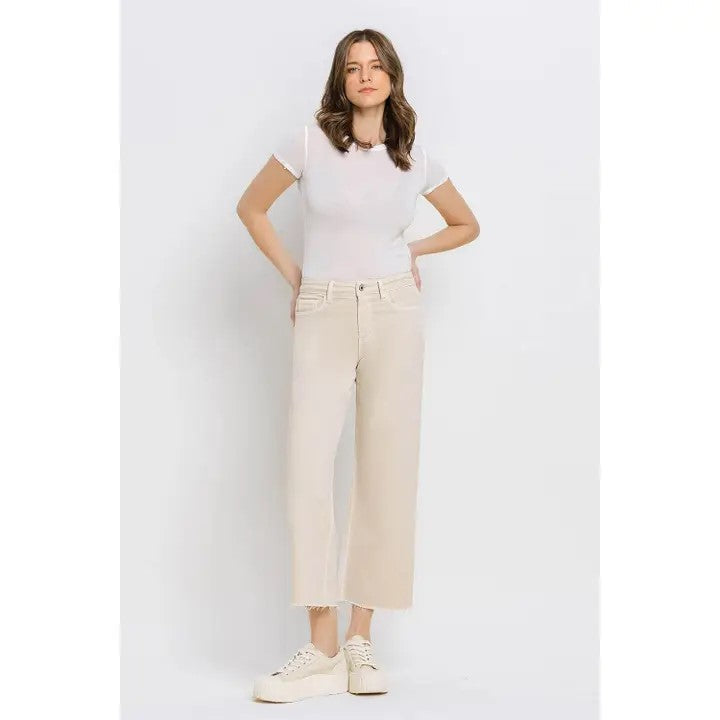 Experience ultimate comfort and style with our High Rise Crop Wide Leg Jeans. Crafted from stretchy denim, these jeans feature a high rise waist, raw hem, and cropped length for a chic look. With a flared wide leg design, you'll be strutting in style. Don't just take our word for it - our model, who is 5'9" and wearing a size 26, agrees! F. Rise: 10 1/4" / Inseam: 26 1/2" / Leg Opening: 20"