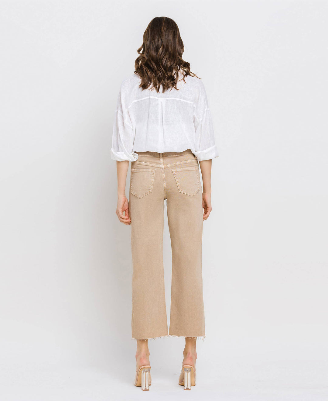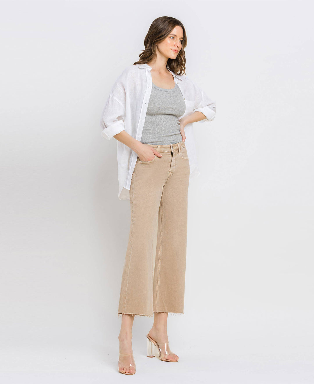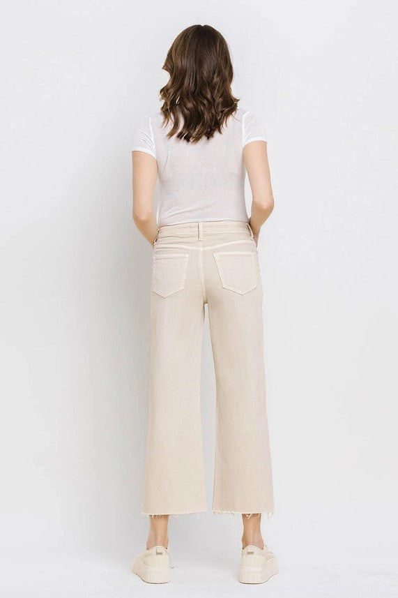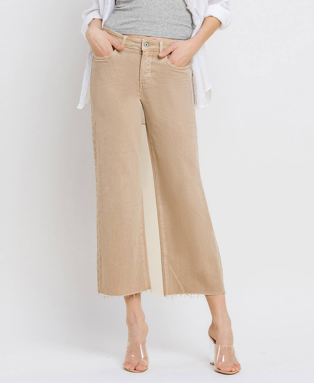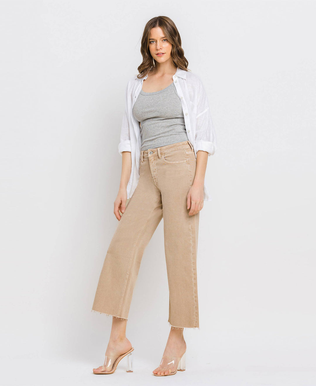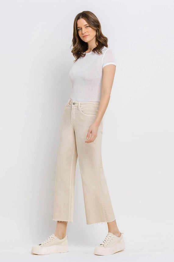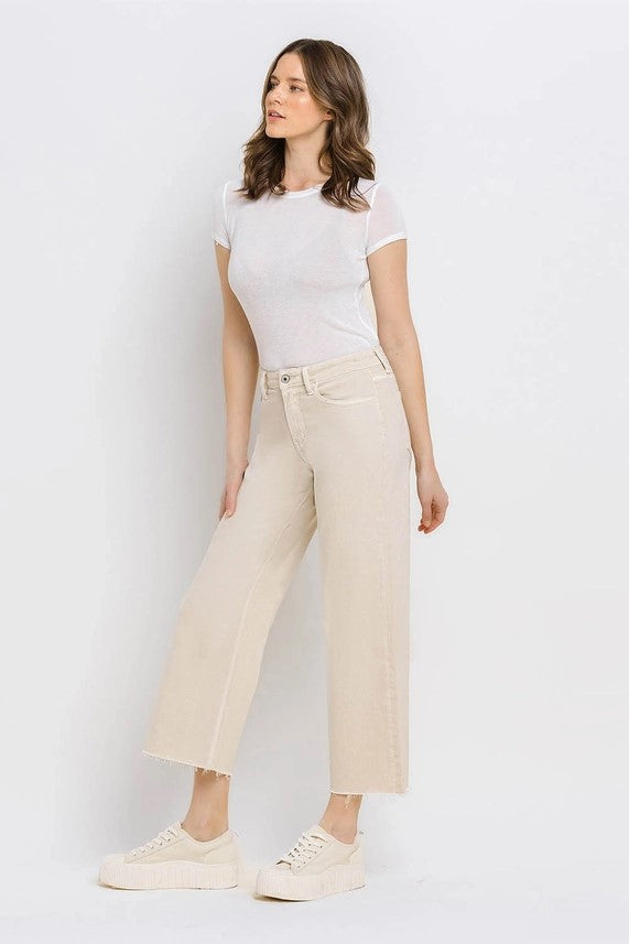 Experience ultimate comfort and style with our High Rise Crop Wide Leg Jeans. Crafted from stretchy denim, these jeans feature a high rise waist, raw hem, and cropped length for a chic look. With a flared wide leg design, you'll be strutting in style. Don't just take our word for it - our model, who is 5'9" and wearing a size 26, agrees! F. Rise: 10 1/4" / Inseam: 26 1/2" / Leg Opening: 20"