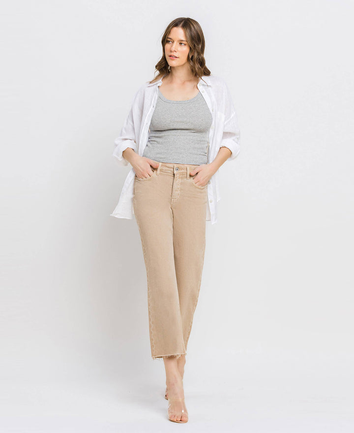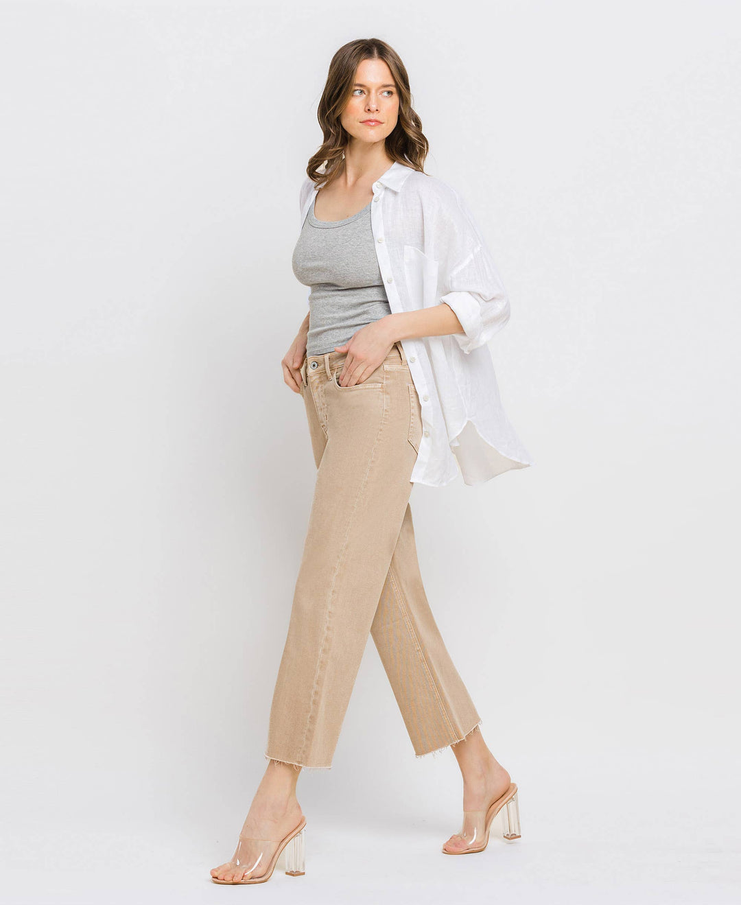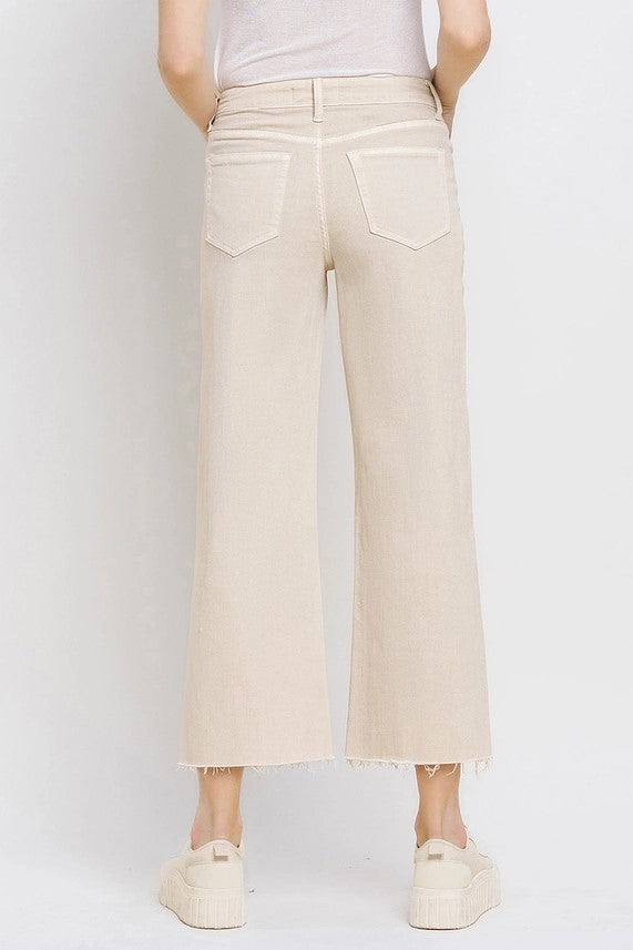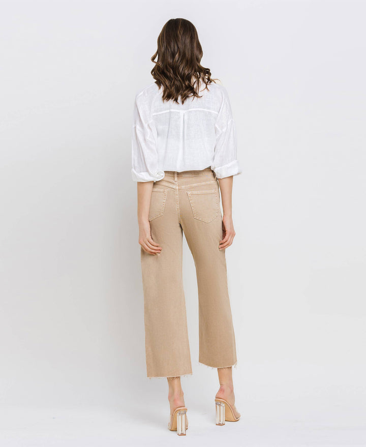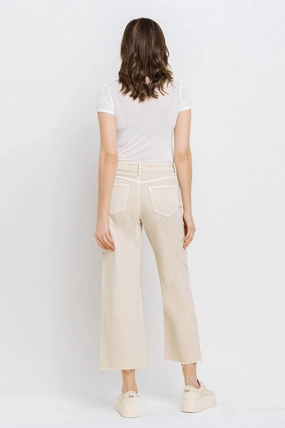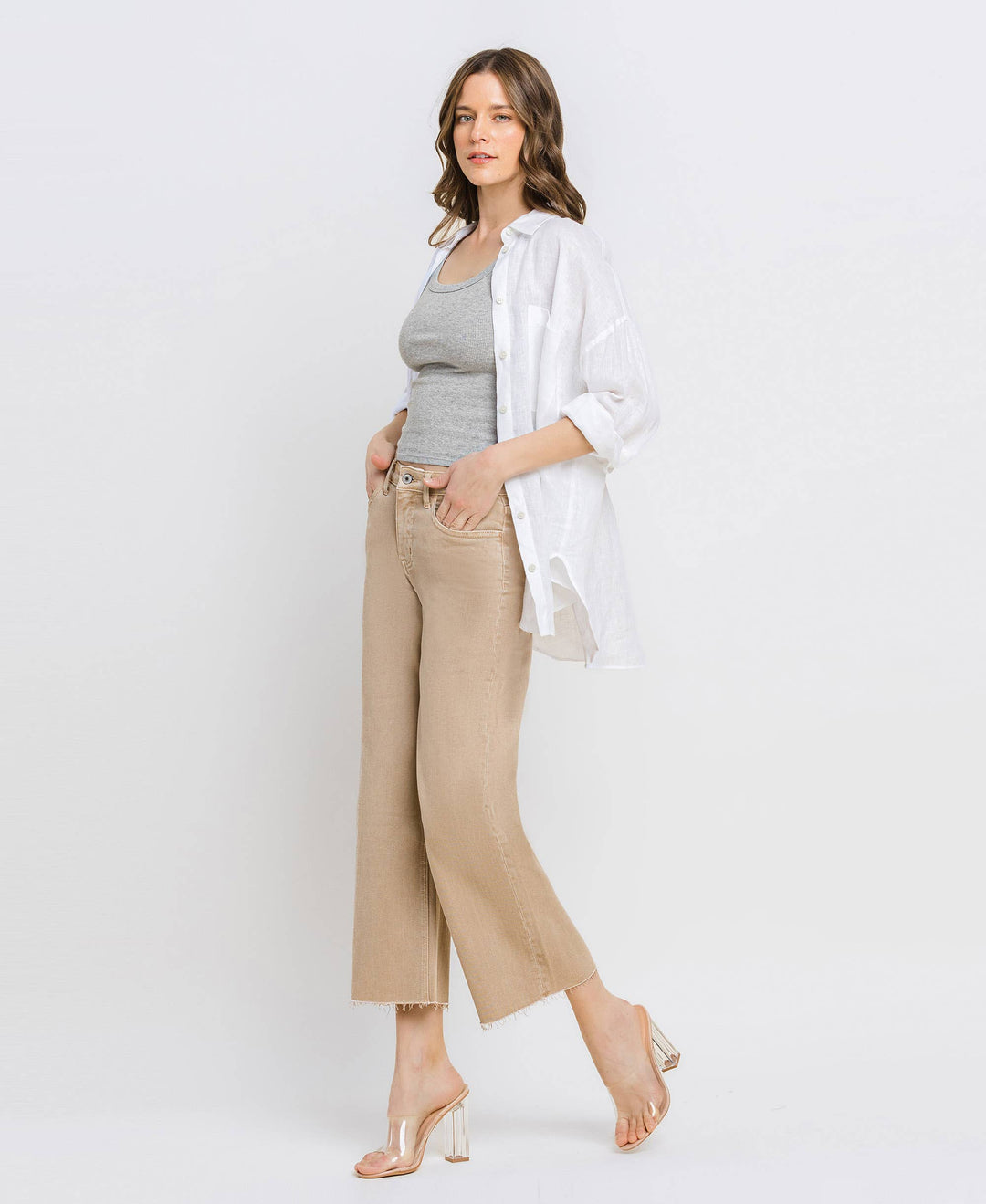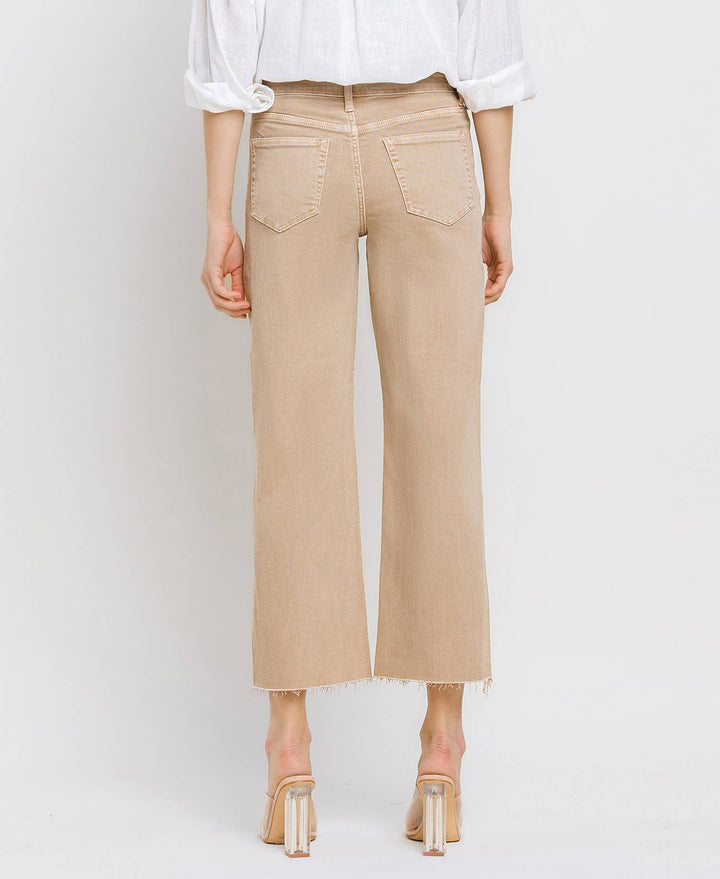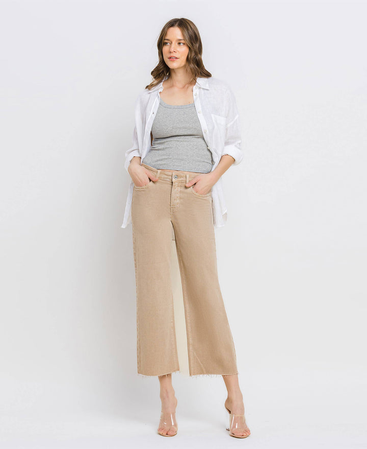 Experience ultimate comfort and style with our High Rise Crop Wide Leg Jeans. Crafted from stretchy denim, these jeans feature a high rise waist, raw hem, and cropped length for a chic look. With a flared wide leg design, you'll be strutting in style. Don't just take our word for it - our model, who is 5'9" and wearing a size 26, agrees! F. Rise: 10 1/4" / Inseam: 26 1/2" / Leg Opening: 20"
