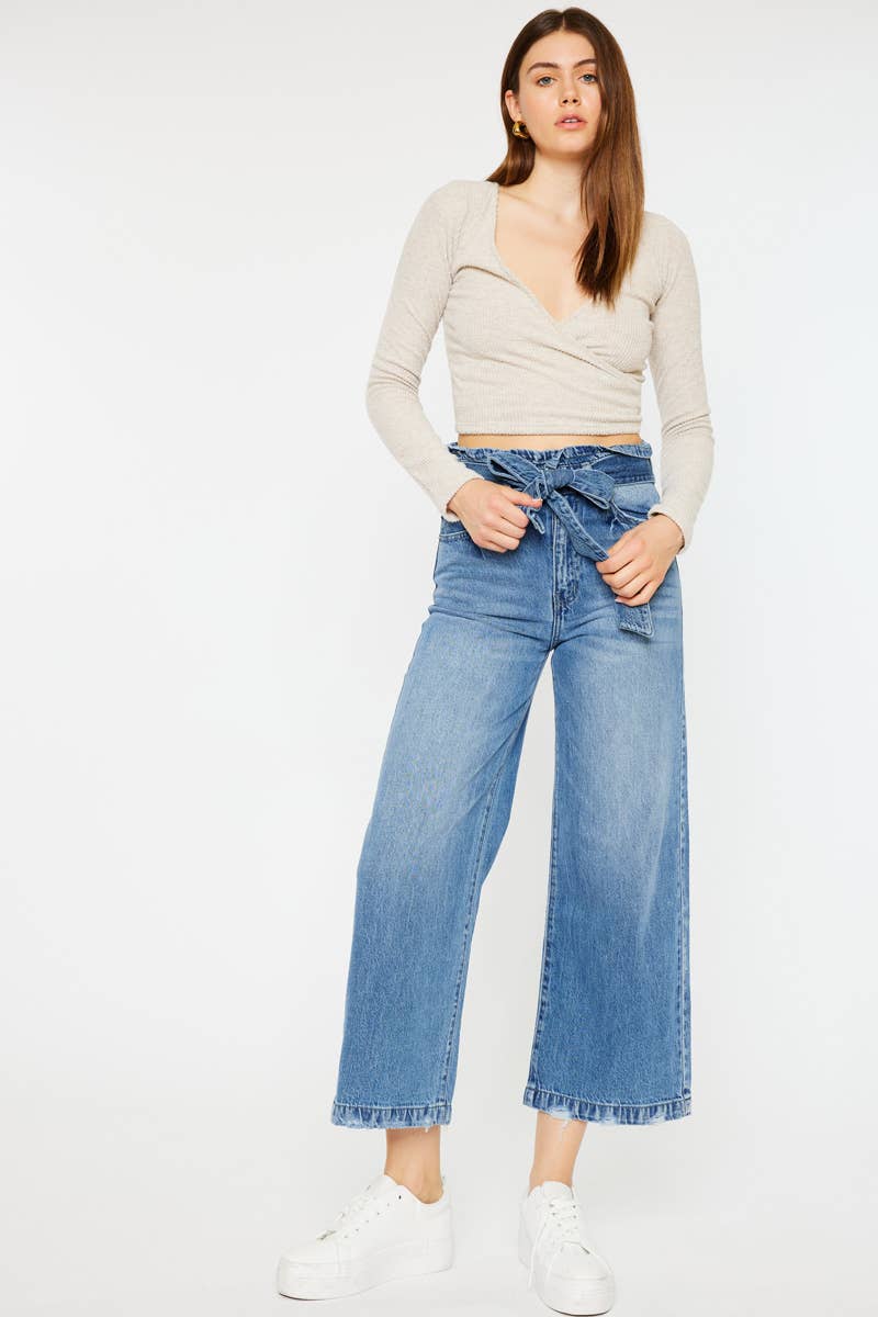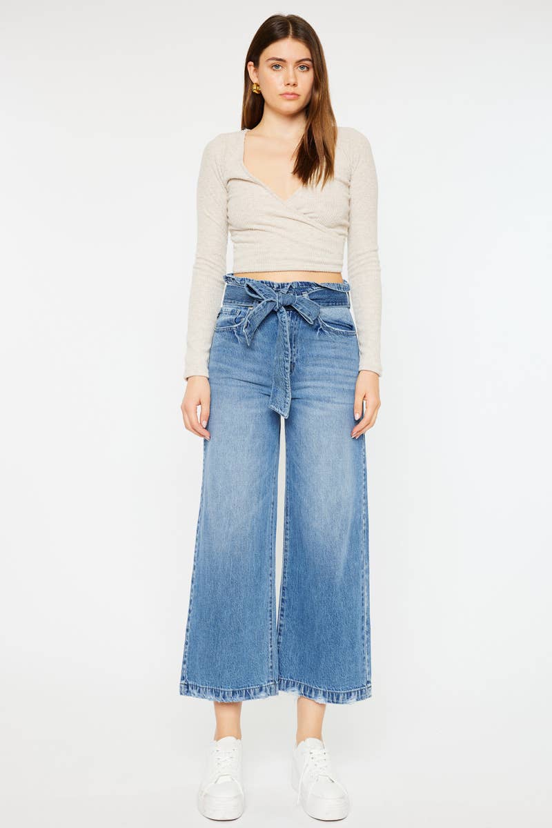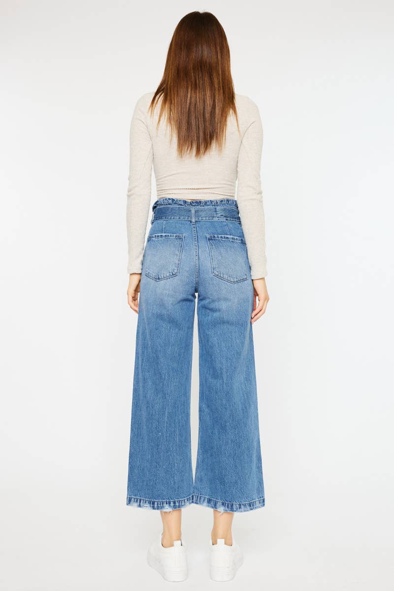 These ultra high rise cropped wide leg jeans offer a rigid, yet stretchable fabric for maximum comfort. The paperbag waist band with a self-belted detail and distressed 1" hem add a trendy touch. With a rise of 12 1/5" and inseam of 26", these jeans provide a flattering fit. Made of 79.8% cotton and 20.2% tencel, Kan Can USA is known for superior fabric quality, fit, and construction.