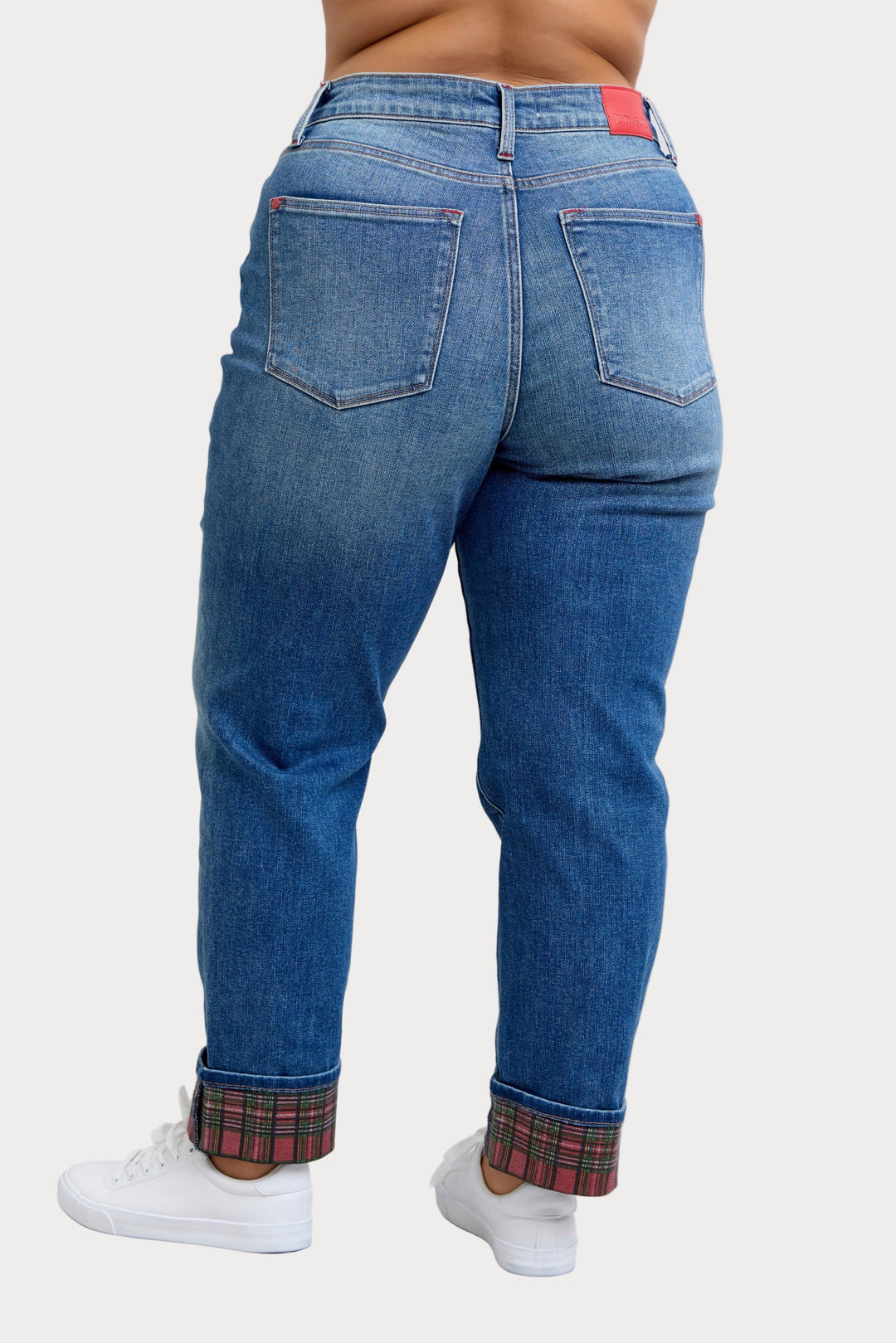 Effortless comfort meets playful detail with the Judy Blue Plaid Cuff Boyfriend Jeans in plus size. Designed with a relaxed, easy fit and soft stretch denim, these jeans feature a cozy plaid cuff that adds a fun pop of personality to your everyday look. The flattering high rise and classic medium wash make them an instant favorite for laid-back days or styled-up weekends.