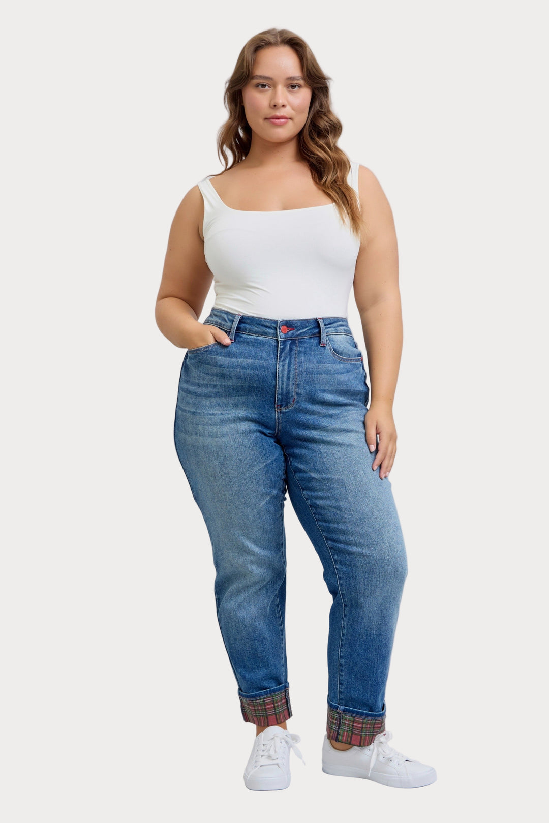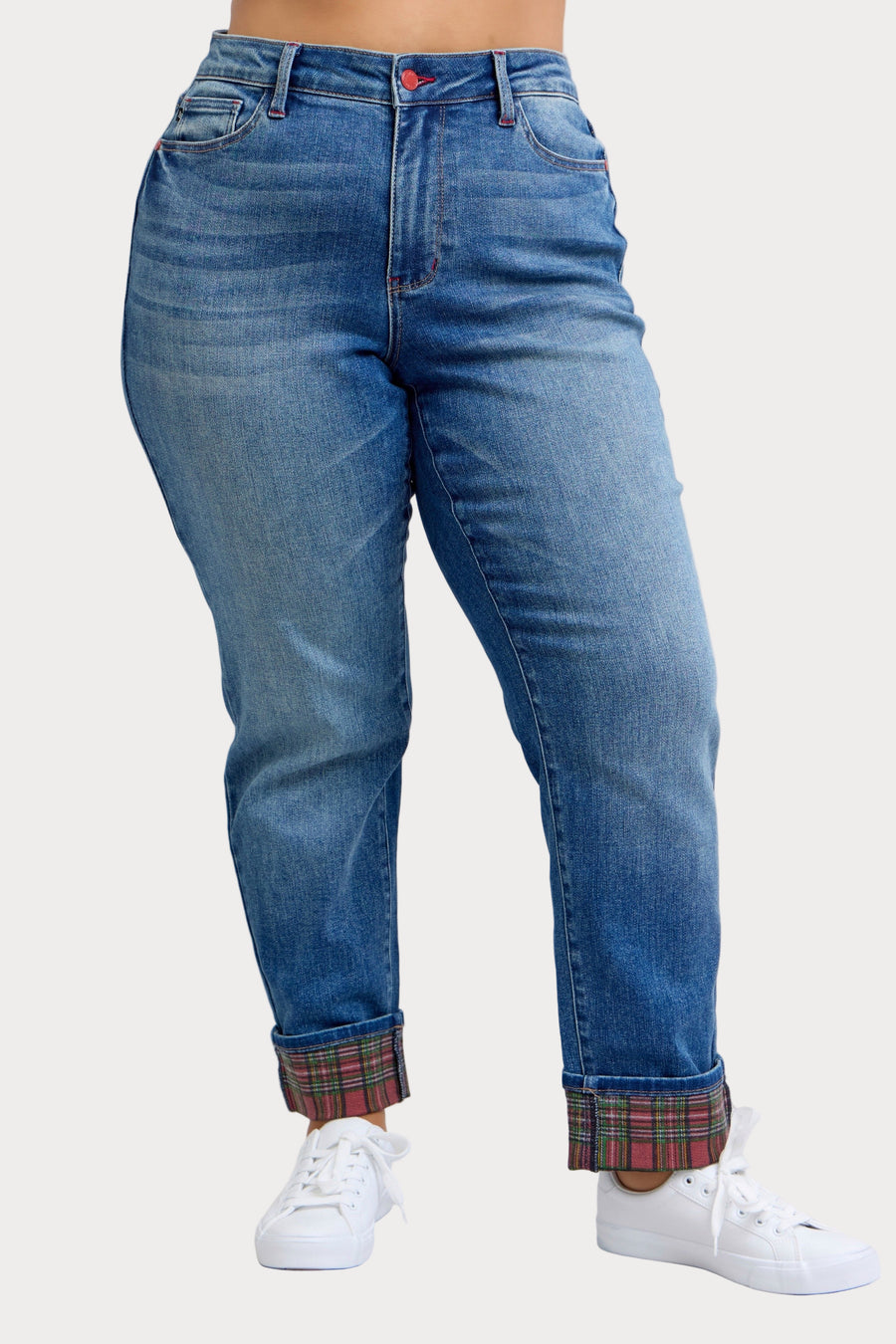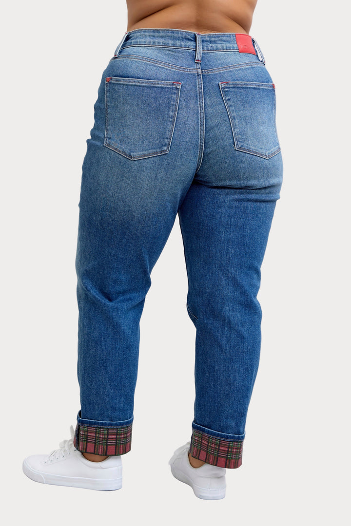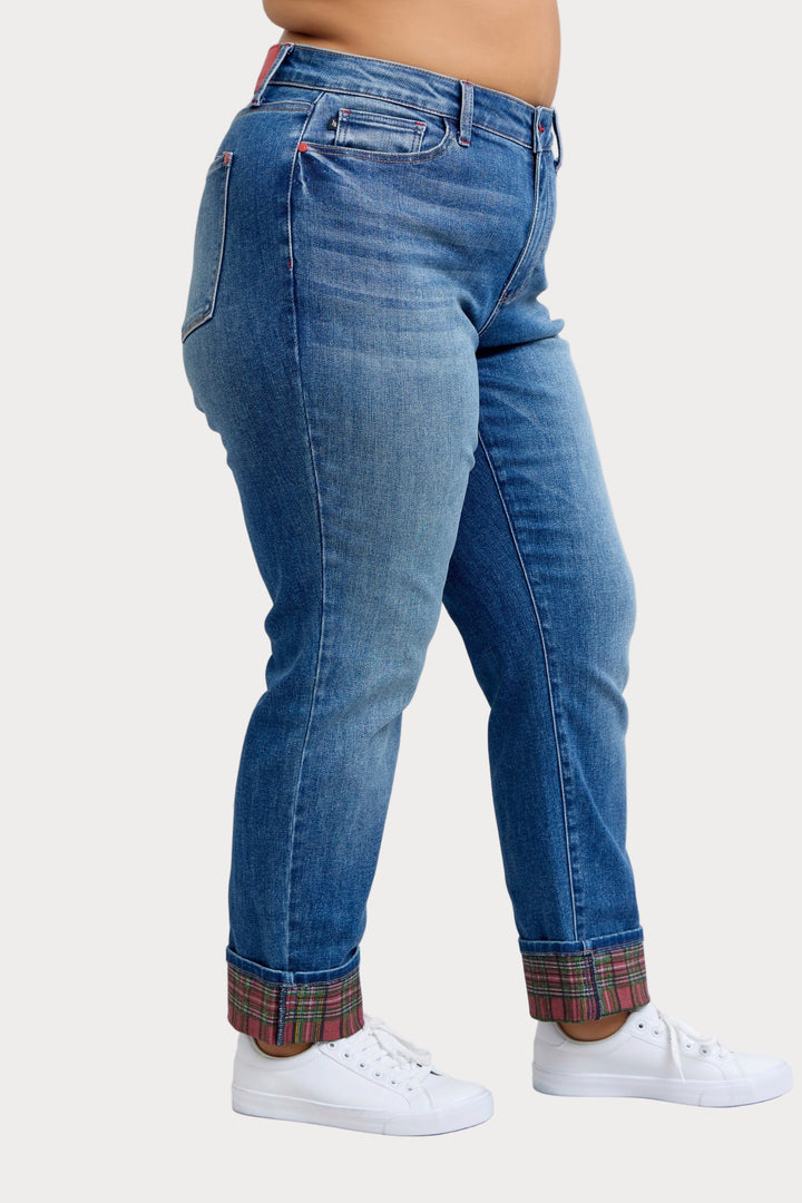 Plus size Judy Blue plaid cuff boyfriend jeans with rolled hem and stretch fit