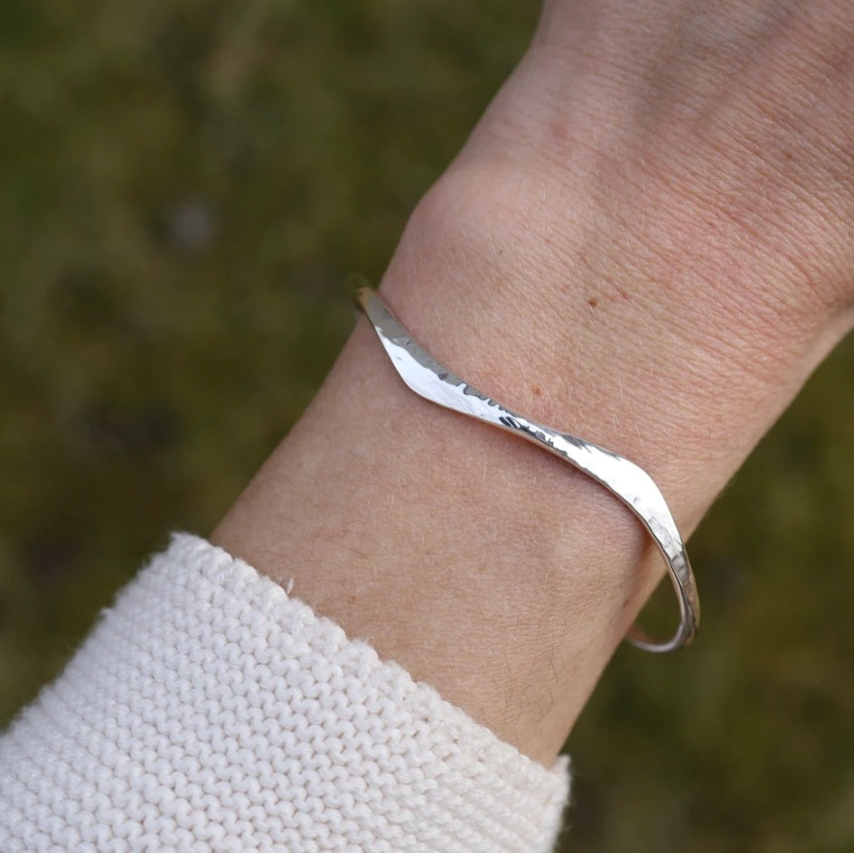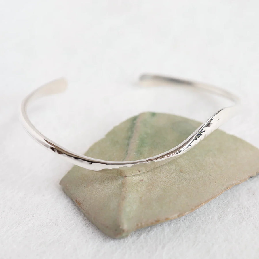 Discover the elegance of the Hammered Wave Cuff Bracelet. Expertly crafted with a unique hammered texture, this stunning piece is made from high-quality materials, ensuring durability and longevity. Handmade in the USA, it serves as the perfect accessory to elevate any outfit, blending sophistication with a modern aesthetic. Embrace a timeless style with this exquisite sterling silver bracelet.