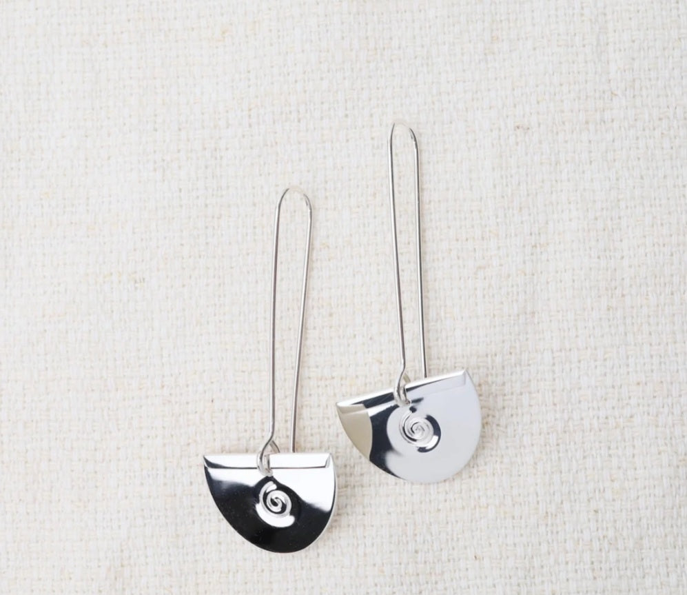 Elevate your style with the Long Wire Half Moon Earring w/ Etched Swirl. These stunning earrings feature an elongated design and intricate etched swirl detail, making them a polished and sophisticated accessory for any outfit. Handmade in the USA from sterling silver, they measure 2 inches in length, ensuring you make a unique statement effortlessly. Perfect for any occasion, add this exquisite touch to your jewellery collection.