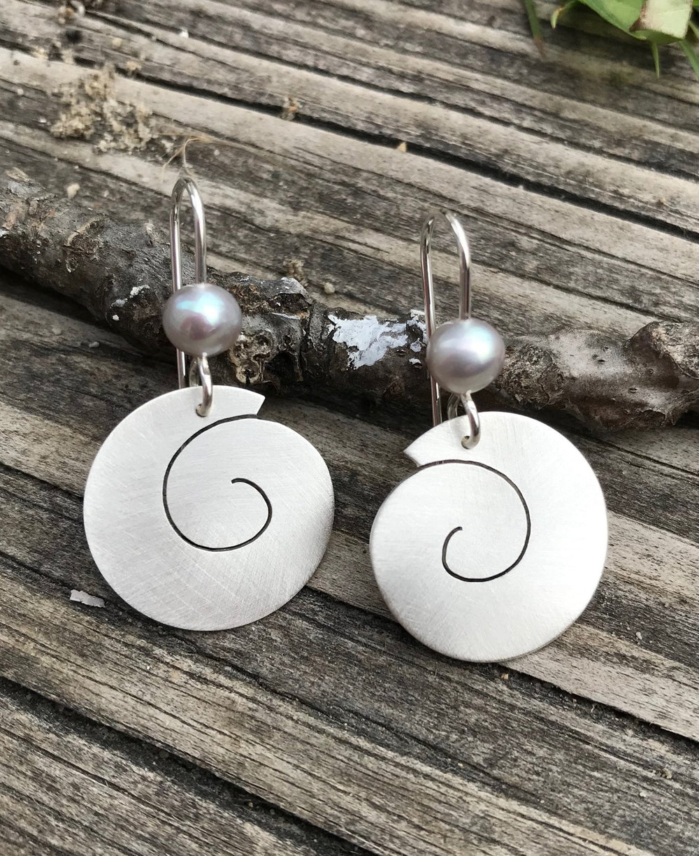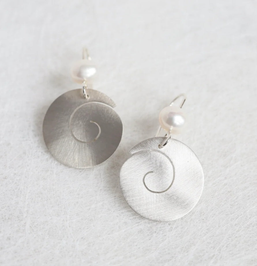 Elevate your accessory collection with our Matte Spiral Earrings featuring a stunning satin finish. The stylish swirl cutout design beautifully showcases a lustrous white pearl, adding a touch of sophistication to any outfit. These handmade earrings in matte sterling silver are perfect for both everyday wear and special occasions, making them a versatile addition to your jewellery box. Indulge in elegance that stands out.