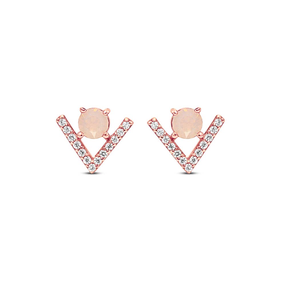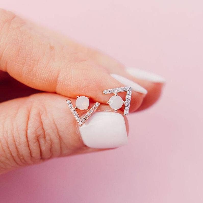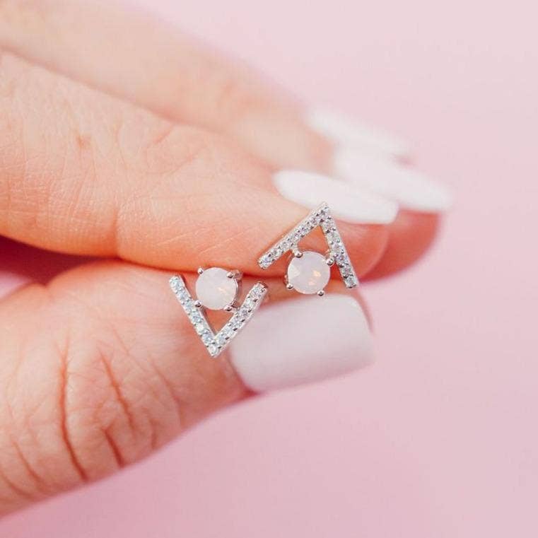 Discover the elegance of the Madeline Studs, a perfect blend of sophistication and sparkle. Available in both Sterling Silver and Rose Gold plated sterling silver, these studs feature a stunning 4mm prong set "Rosewater Opal" Swarovski center stone. Surrounding the main stone, white pavé set cubic zirconia stones add an extra touch of brilliance. The friction backing ensures a secure and comfortable fit, making these earrings a timeless accessory for any occasion. Enhance your collection with the timeless beauty of the Madeline Studs.