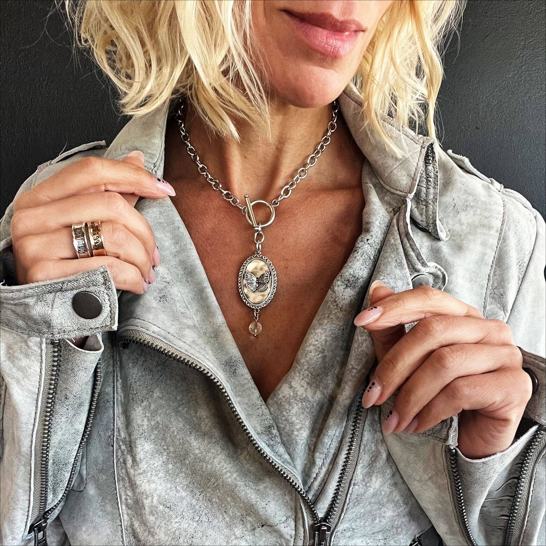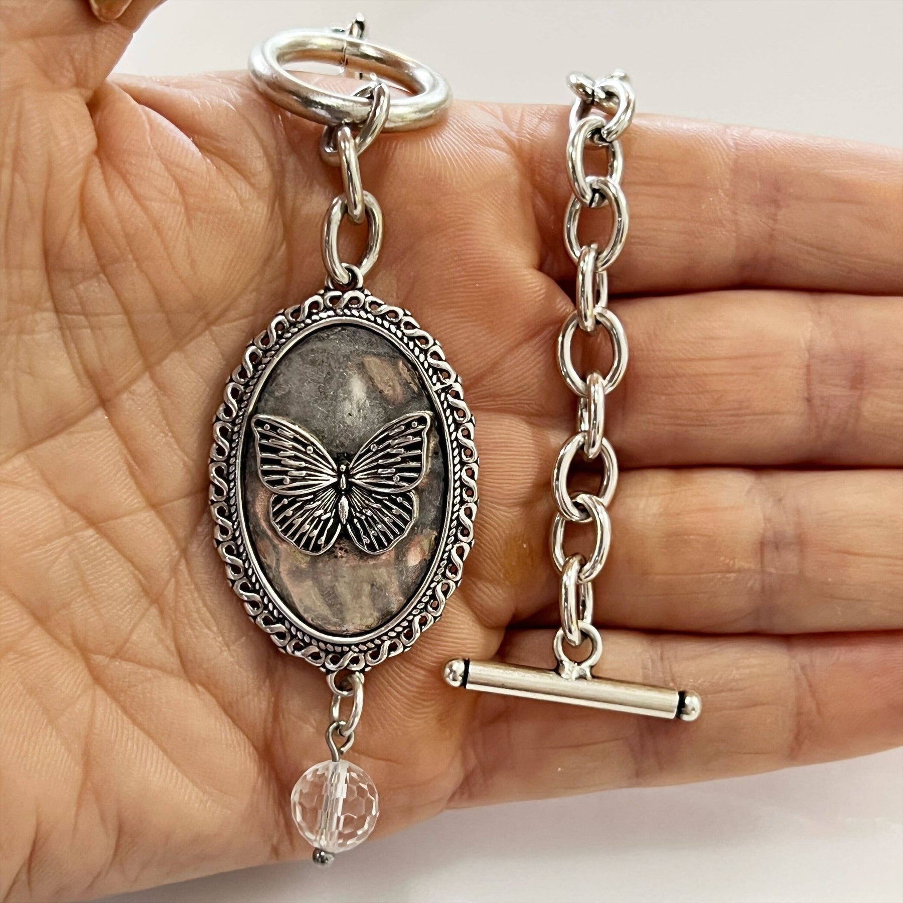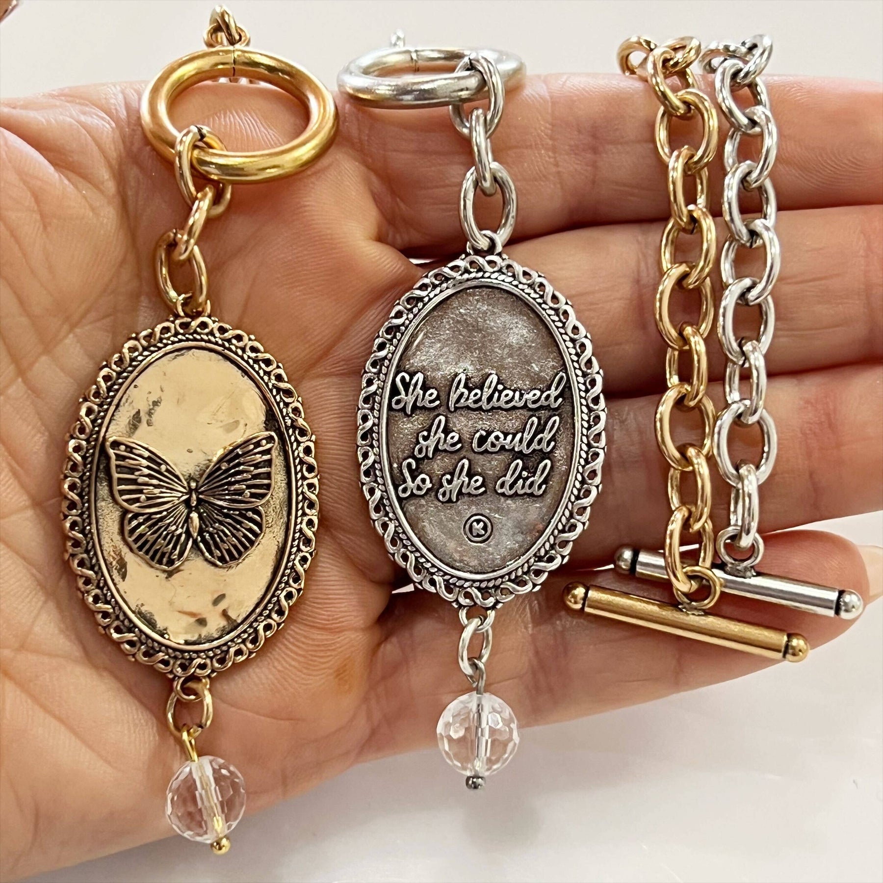 Elevate your style and spirit with the She Believed She Could... Butterfly Choker. Made from a 9mm plated brass chain, available in luxurious gold or silver, this necklace features a stunning crystal quartz. With adjustable lengths of 15", 16.5", or 18", you can find your perfect fit. This boho chic choker is more than just an accessory; it embodies empowerment and inspiration. Handmade with love, it serves as a daily reminder to believe in yourself. Perfect for layering or wearing solo, it’s a must-have for those who embrace their confidence.