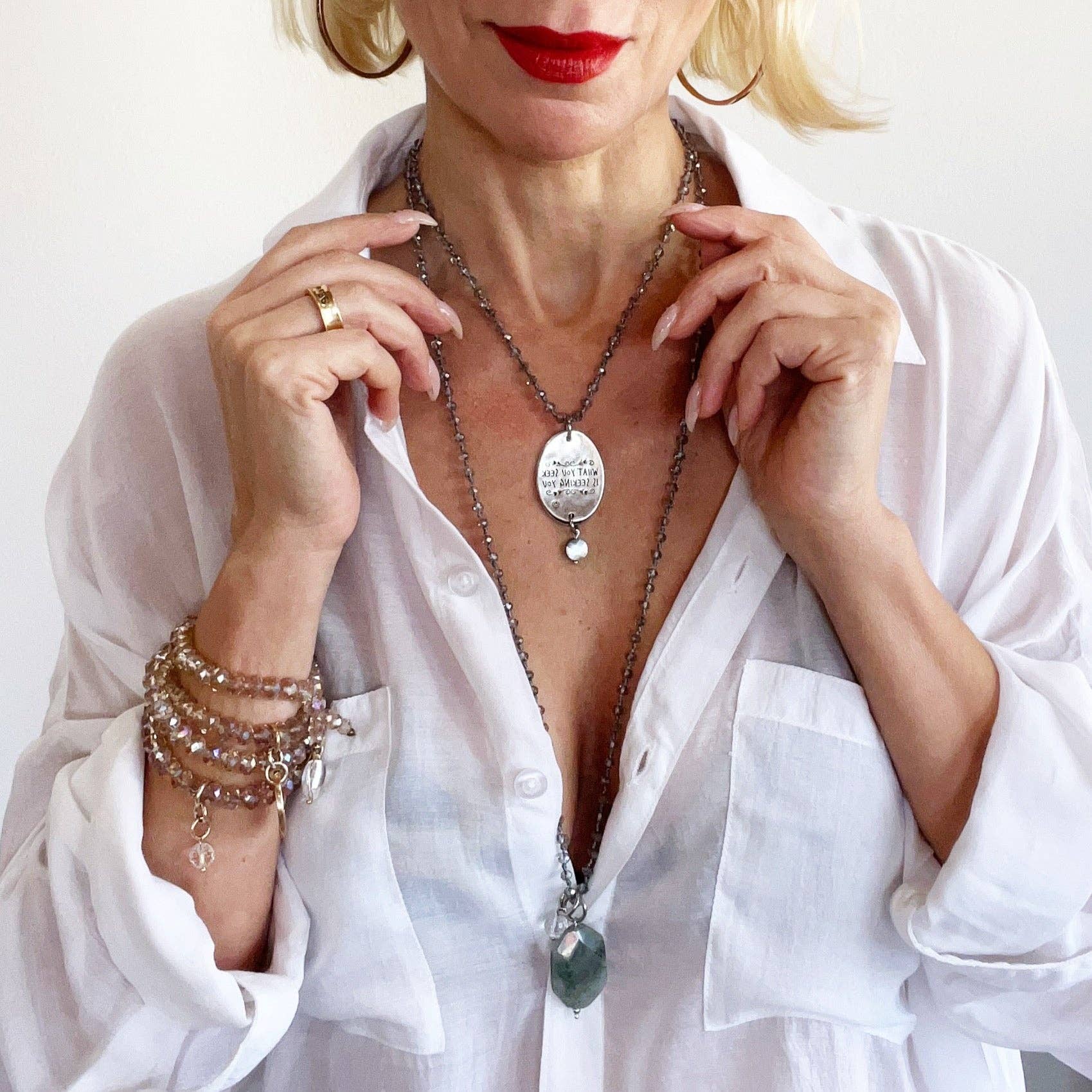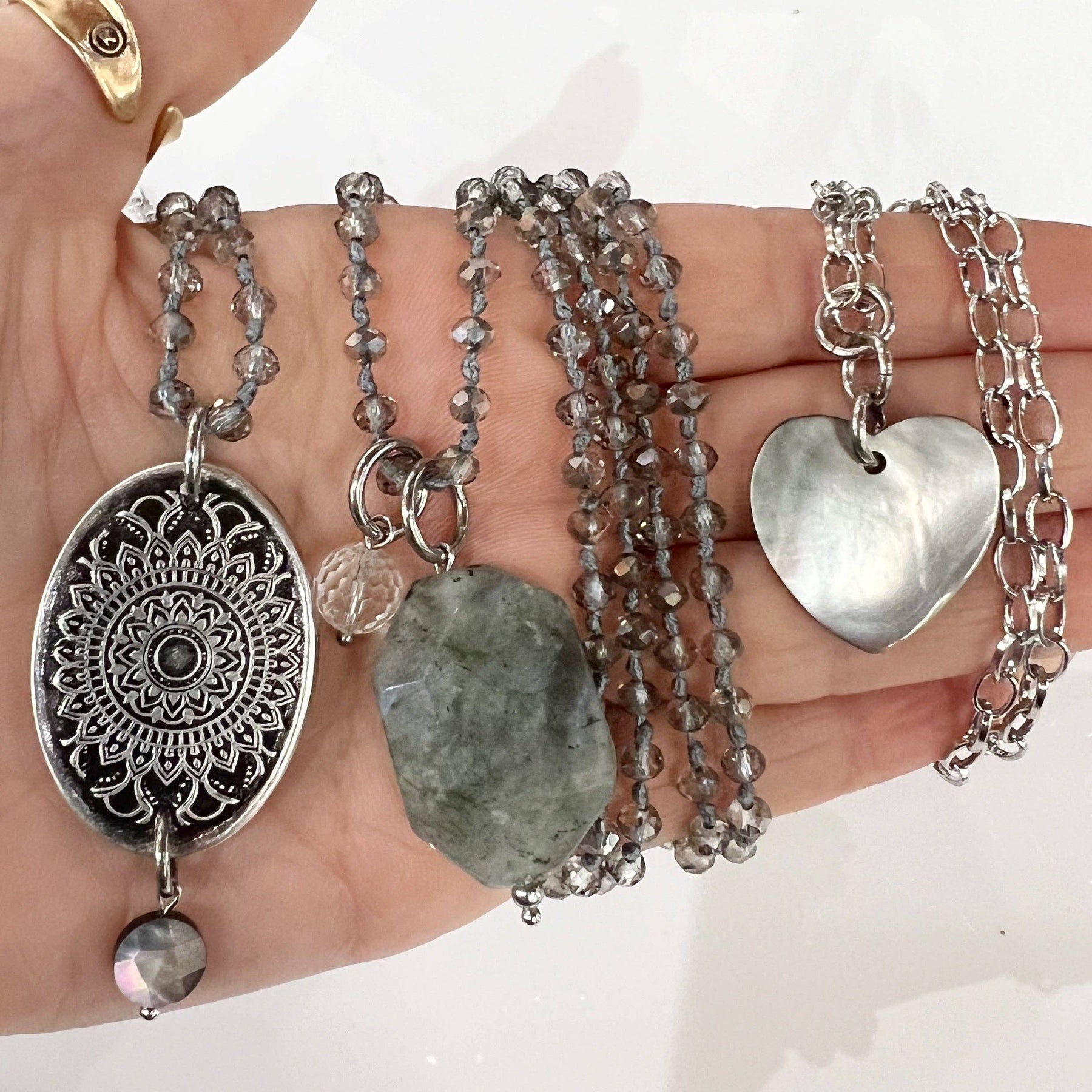 - Choose silver with gray crystal beads, labradorite, crystal quartz, and black lip pearl
