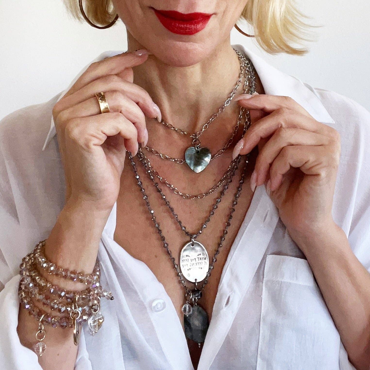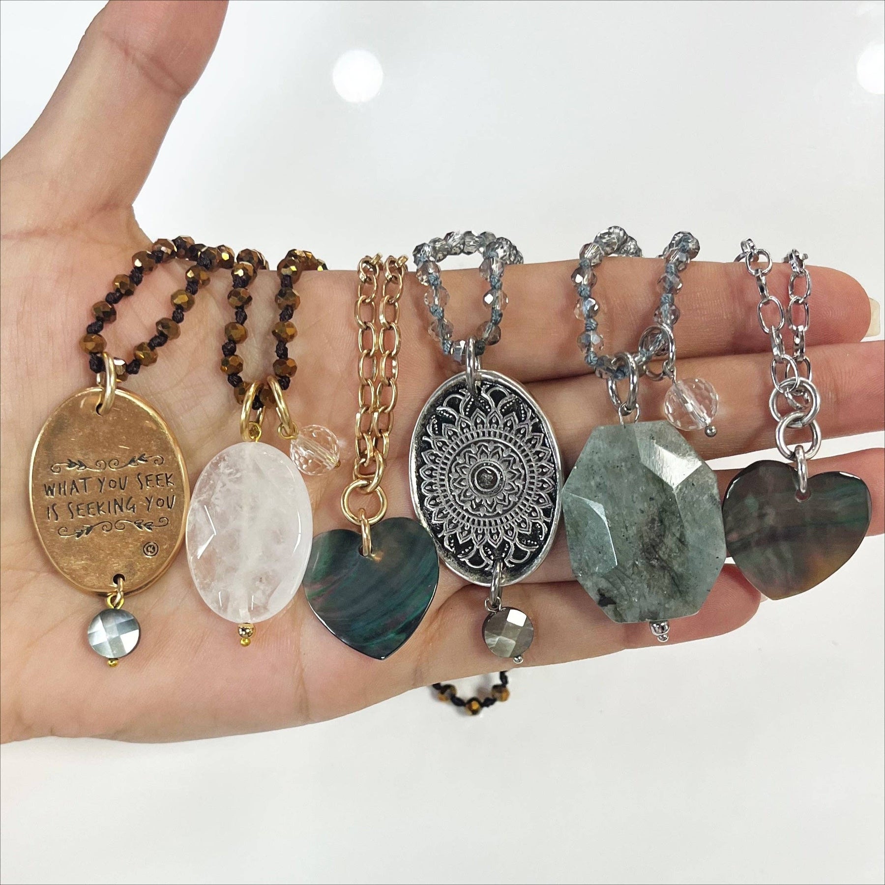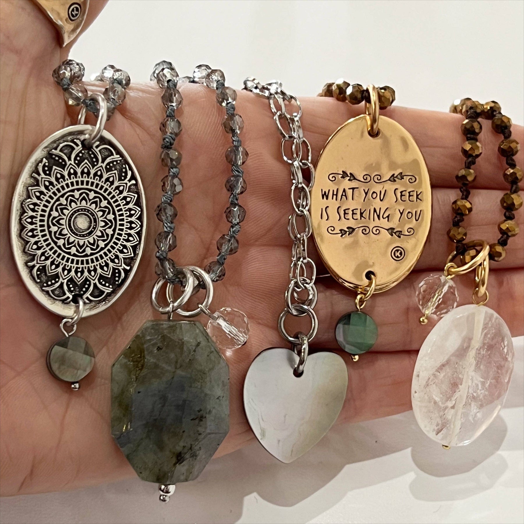 Discover the elegance of the What You Seek Is Seeking You Original Layering Bundle. This outstanding set features an Original Necklace with your choice of a silver or gold stainless steel chain, elegantly showcasing a stunning abalone heart.