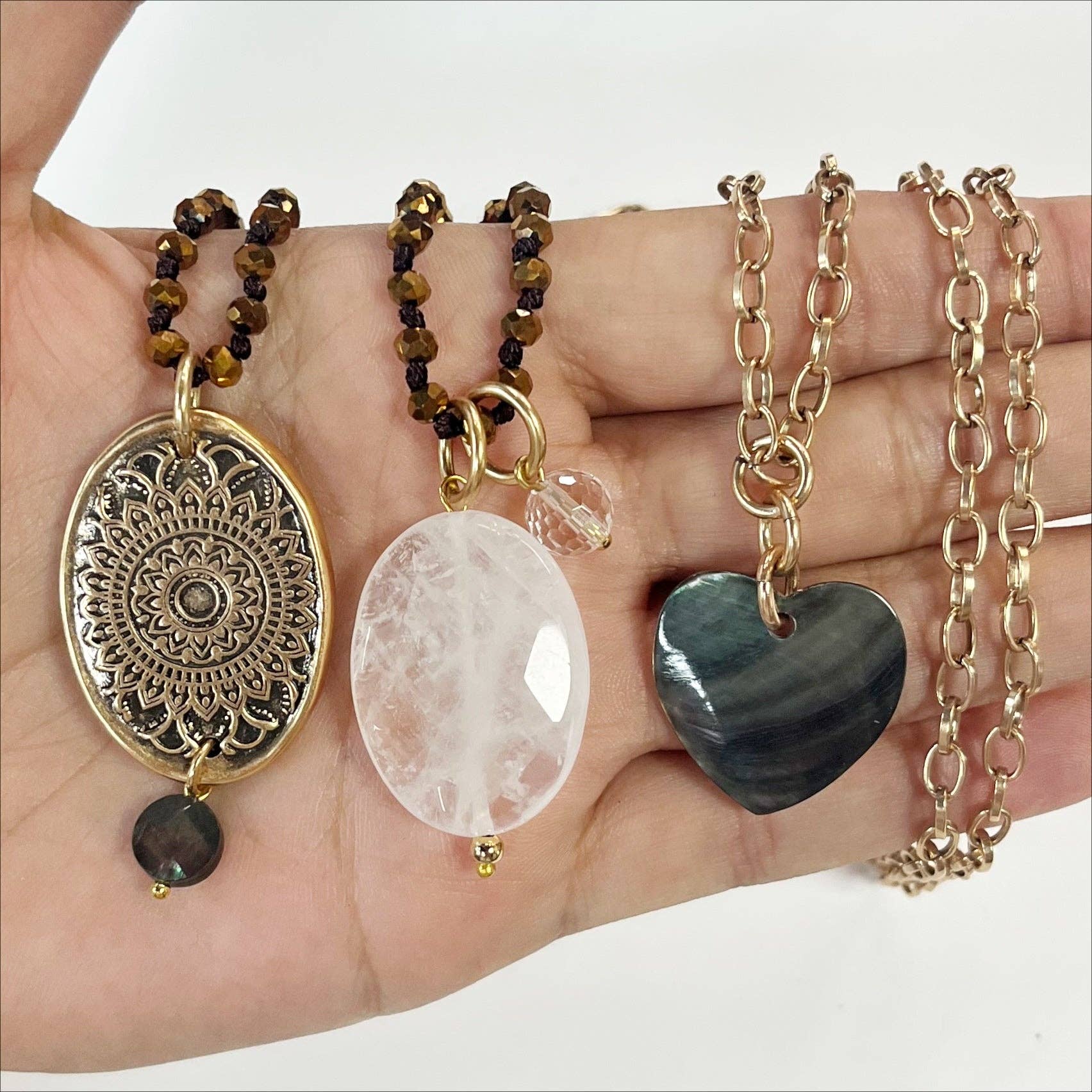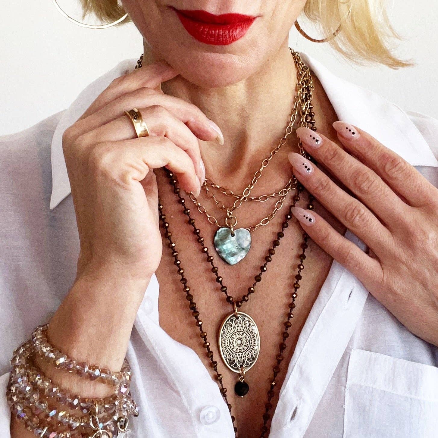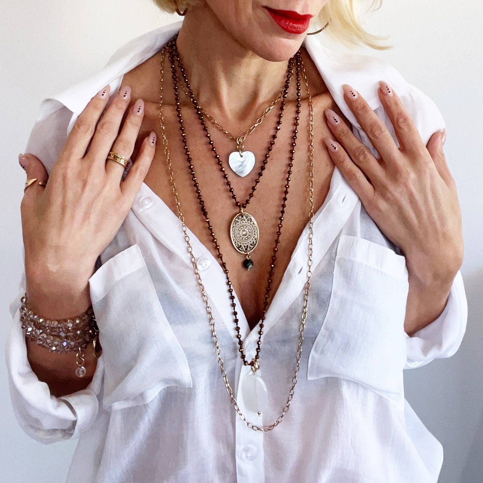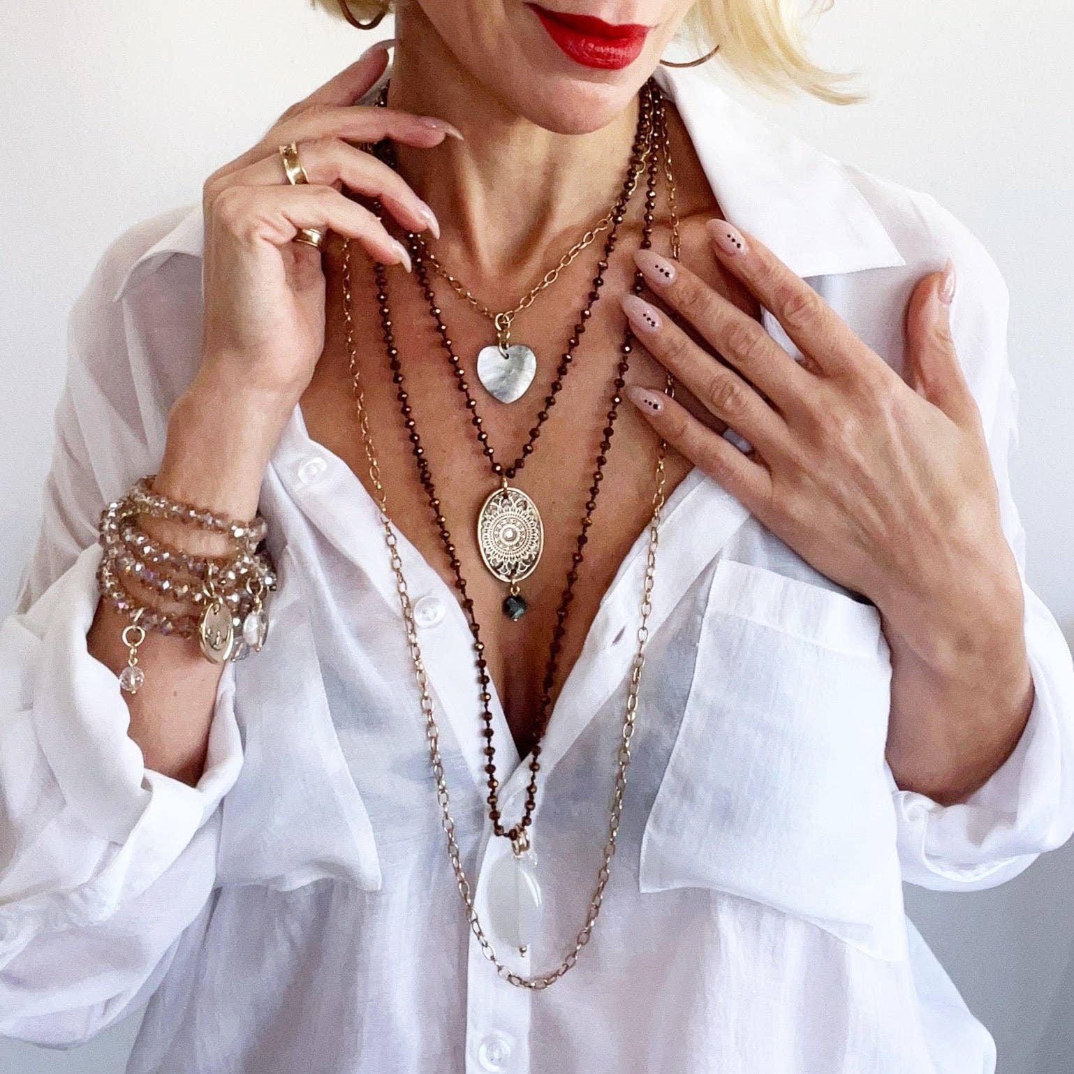 - Opt for gold with copper crystal beads, agate, crystal quartz, and black lip pearl