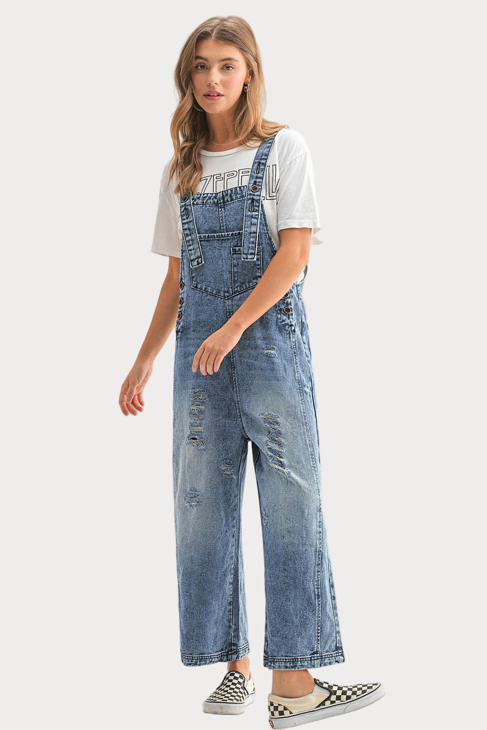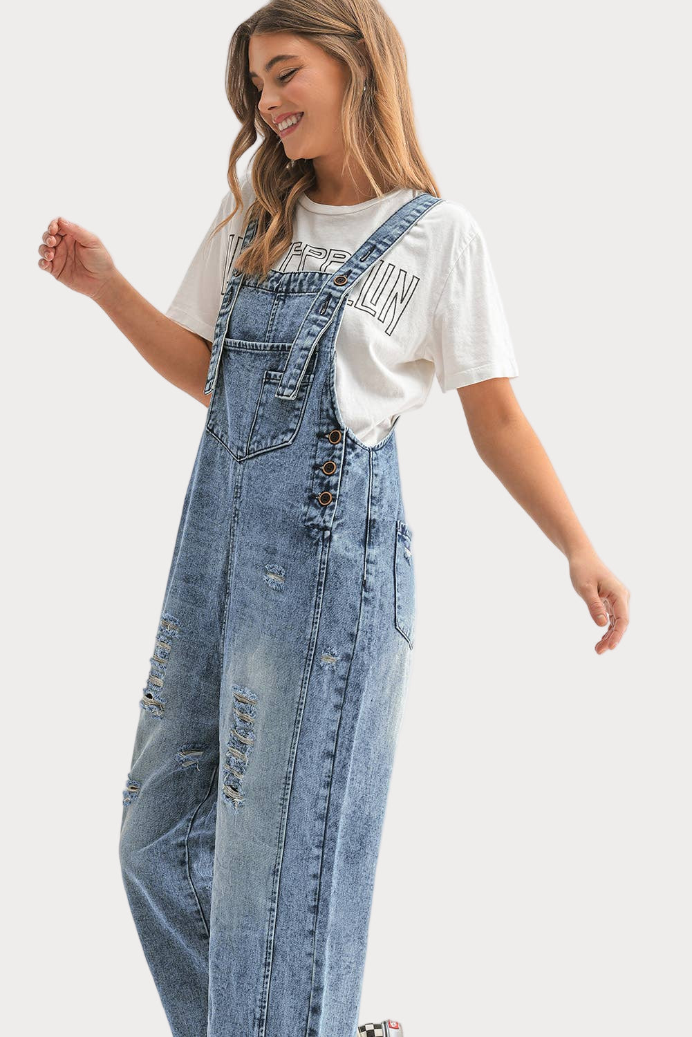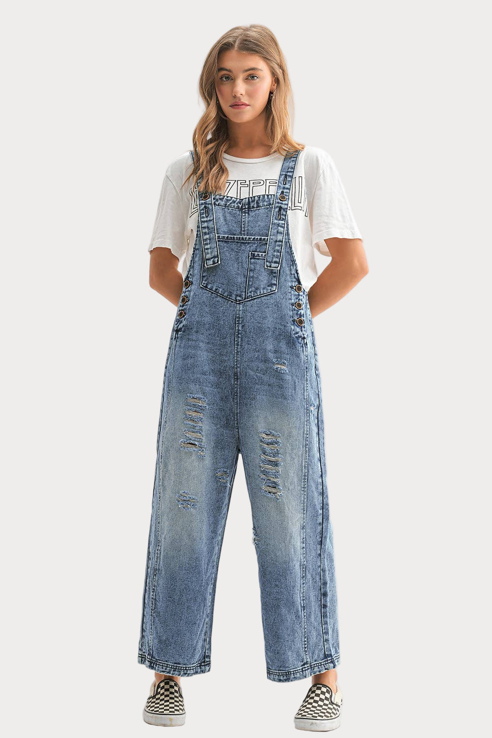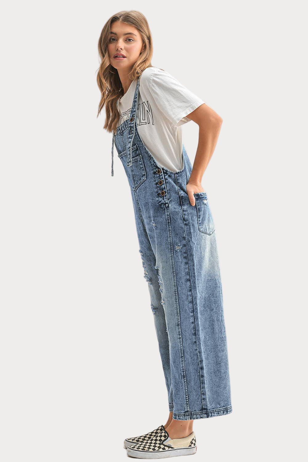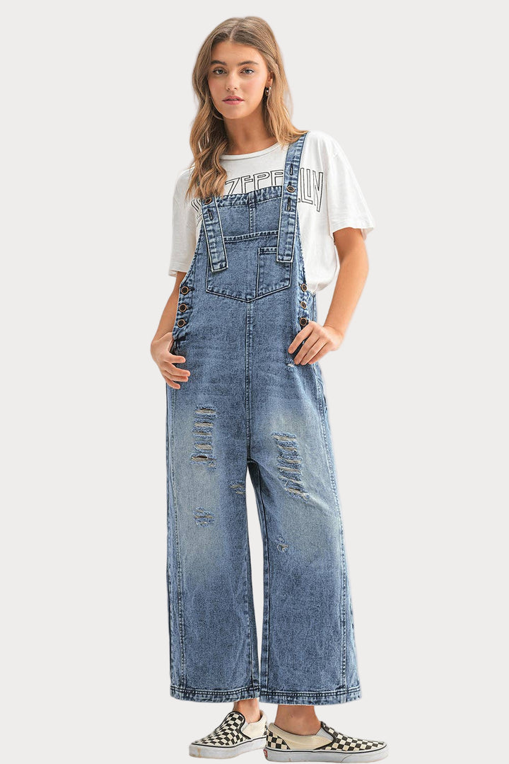Discover effortless comfort with the Distressed Wide-Leg Denim Overalls. This overalls is designed with relaxed ease, making it a versatile piece you’ll love for layering or wearing on its own.