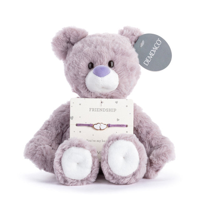 Introducing the Friendship Purple Bear, the perfect combination of a cuddly bear and a stylish accessory! This 8-inch bear comes with a sparkling piece of wearable jewelry, making it a perfect gift for your loved ones. Its soft and huggable body will bring joy and comfort, while the unique jewelry adds a touch of dazzle to any outfit.