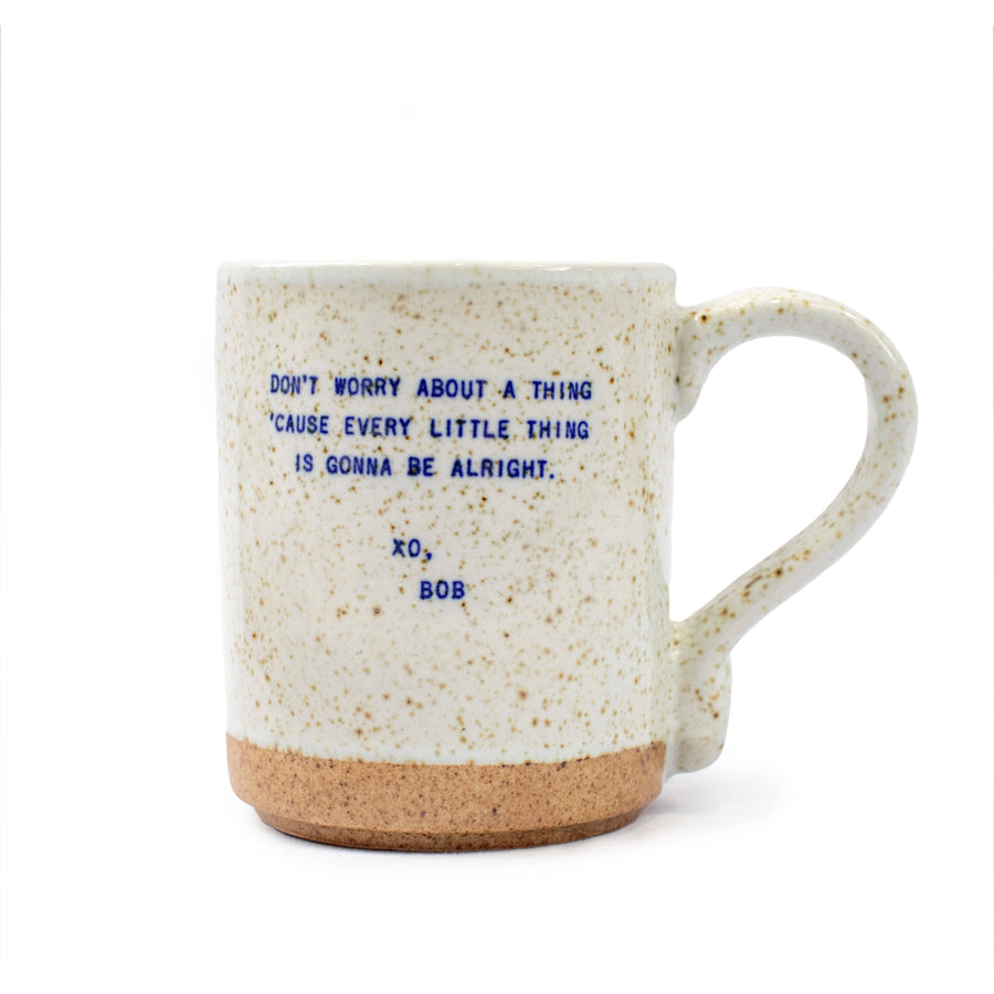 Speckled ceramic mug with quote “Keep it lit. XO, Rudolph.”