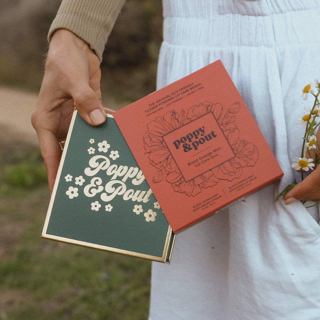 Introducing our Lip Care Duo in Blood Orange Mint, the perfect addition to your lip care routine. This exquisite gift set features a matching lip balm and lip scrub, elegantly packaged in a recyclable green and gold box.