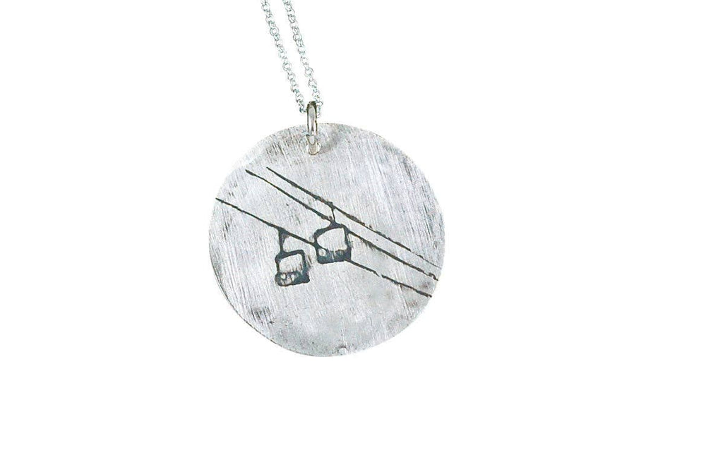 Introducing the Chairlift Pendant, a stunning 3/4" diameter sterling silver disc that captures the essence of the slopes. Crafted by hand, this pendant features a unique roller-printed design inspired by a chairlift, making it the perfect gift for ski and snowboard enthusiasts.