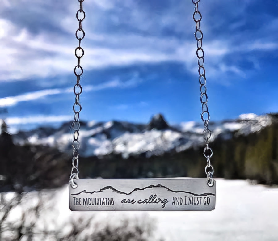 Discover the Mountains Calling Necklace, a beautiful tribute to nature inspired by the words of John Muir. This exquisite pendant features the quote “The mountains are calling and I must go...” crafted on brass and paired with an 18" oxidized sterling chain.