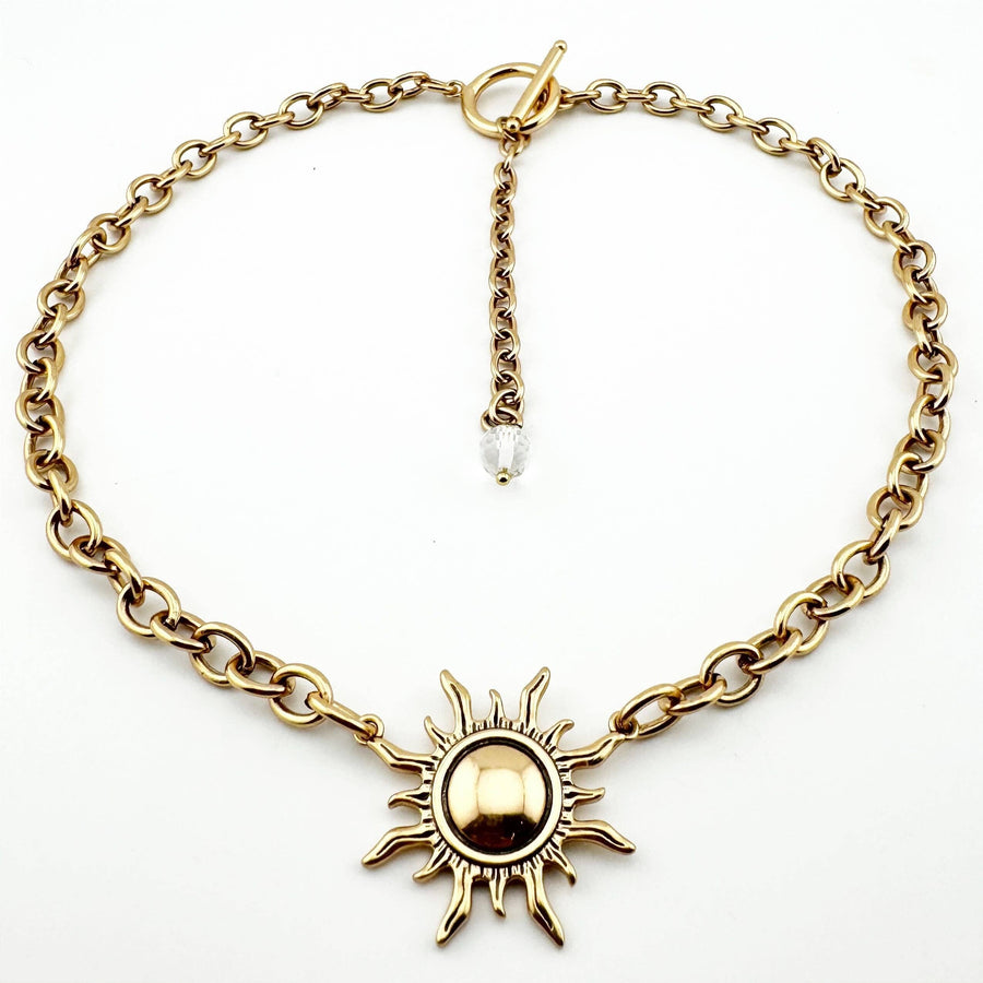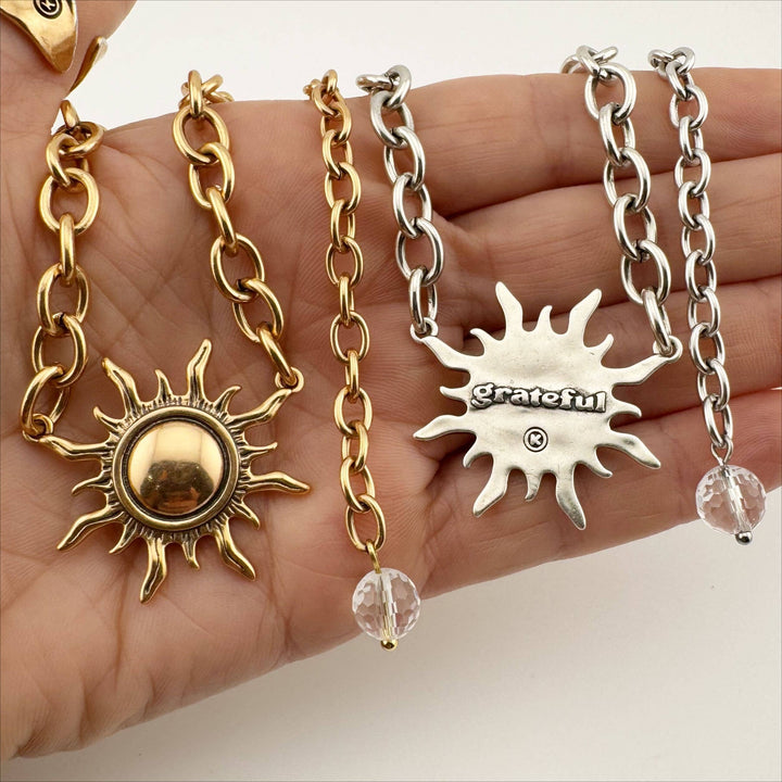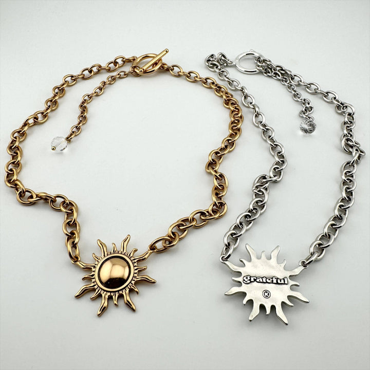 Brighten your day with the "Grateful" Sun Choker Necklace! This playful accessory adds a sunny sparkle to any outfit, reminding you to shine and stay thankful. Perfect for layering or wearing solo, it’s a cheerful touch that keeps good vibes close to your heart.