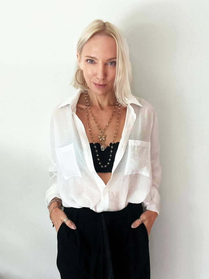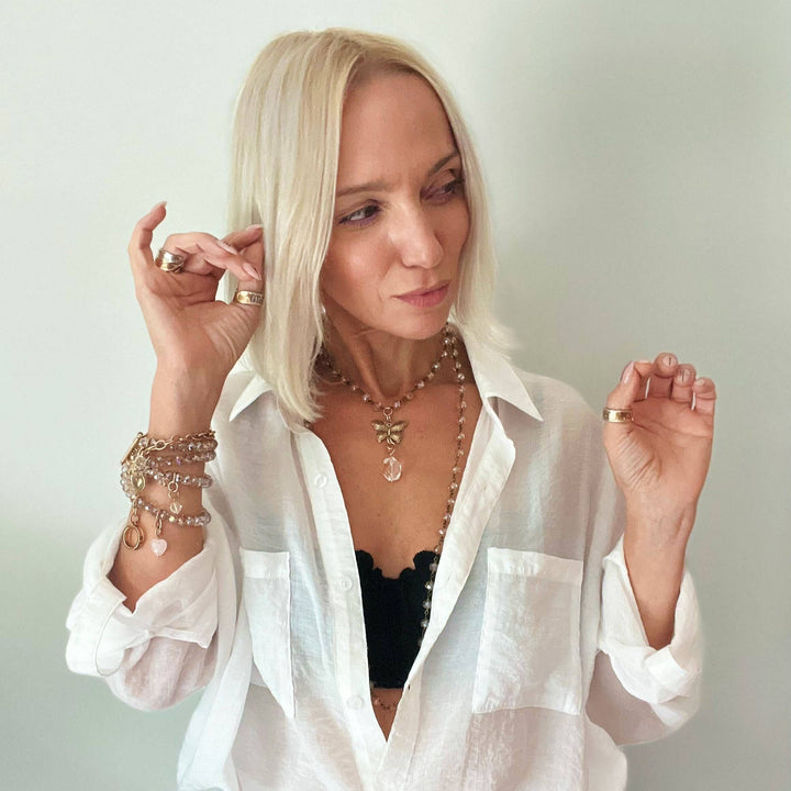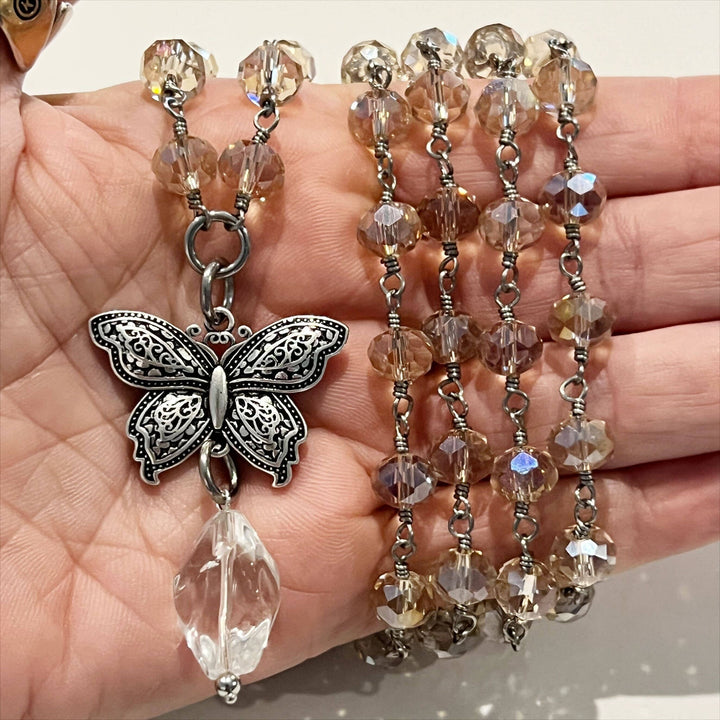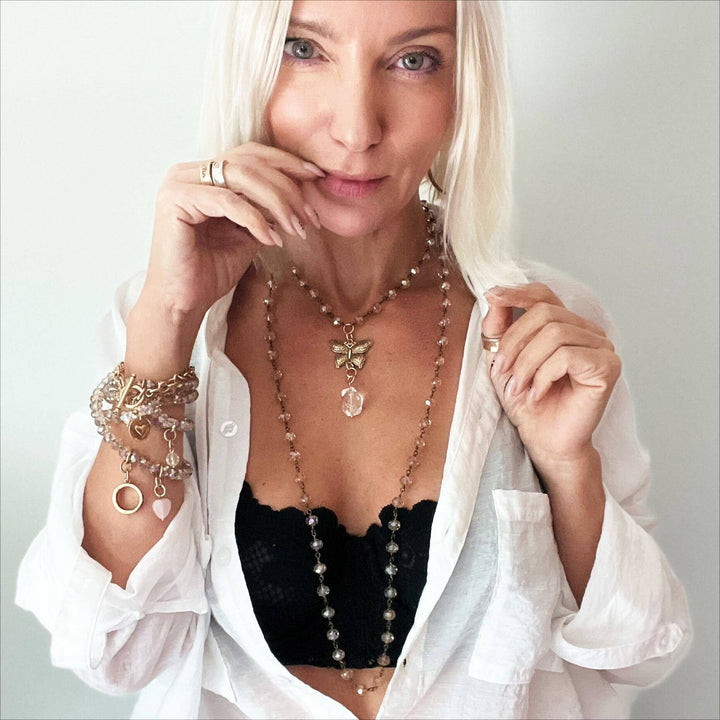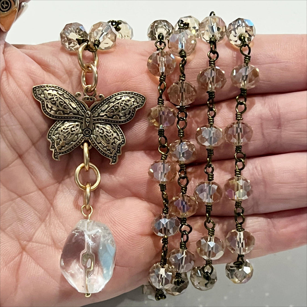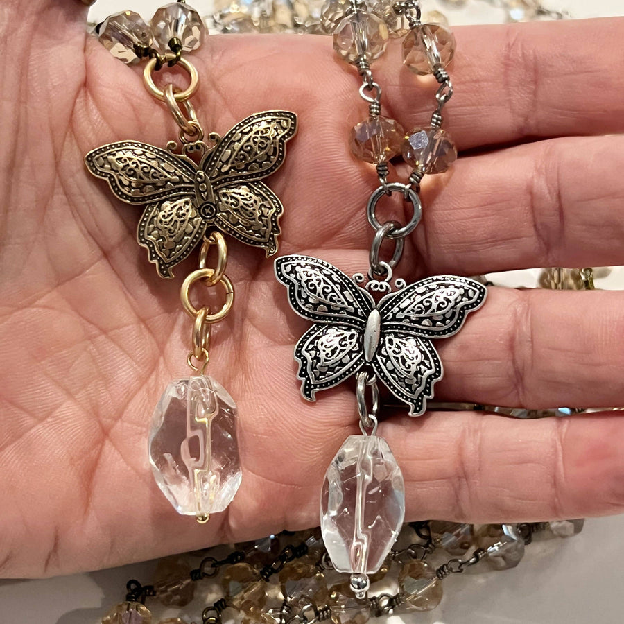 Add a touch of whimsy to your look with the "Joy" Butterfly Long Rosary Chain Necklace. Featuring delicate butterfly charms along a graceful rosary-style chain, this necklace brings playful elegance to any outfit. Its long length makes it perfect for layering or wearing solo as a statement piece that spreads happiness wherever you go.