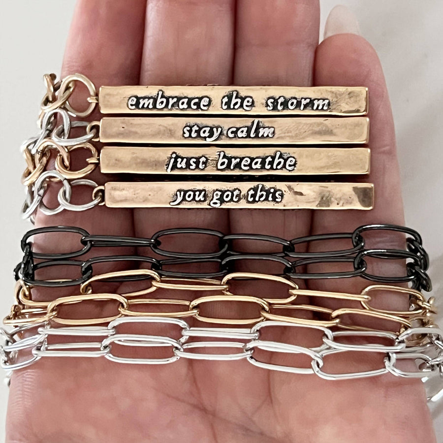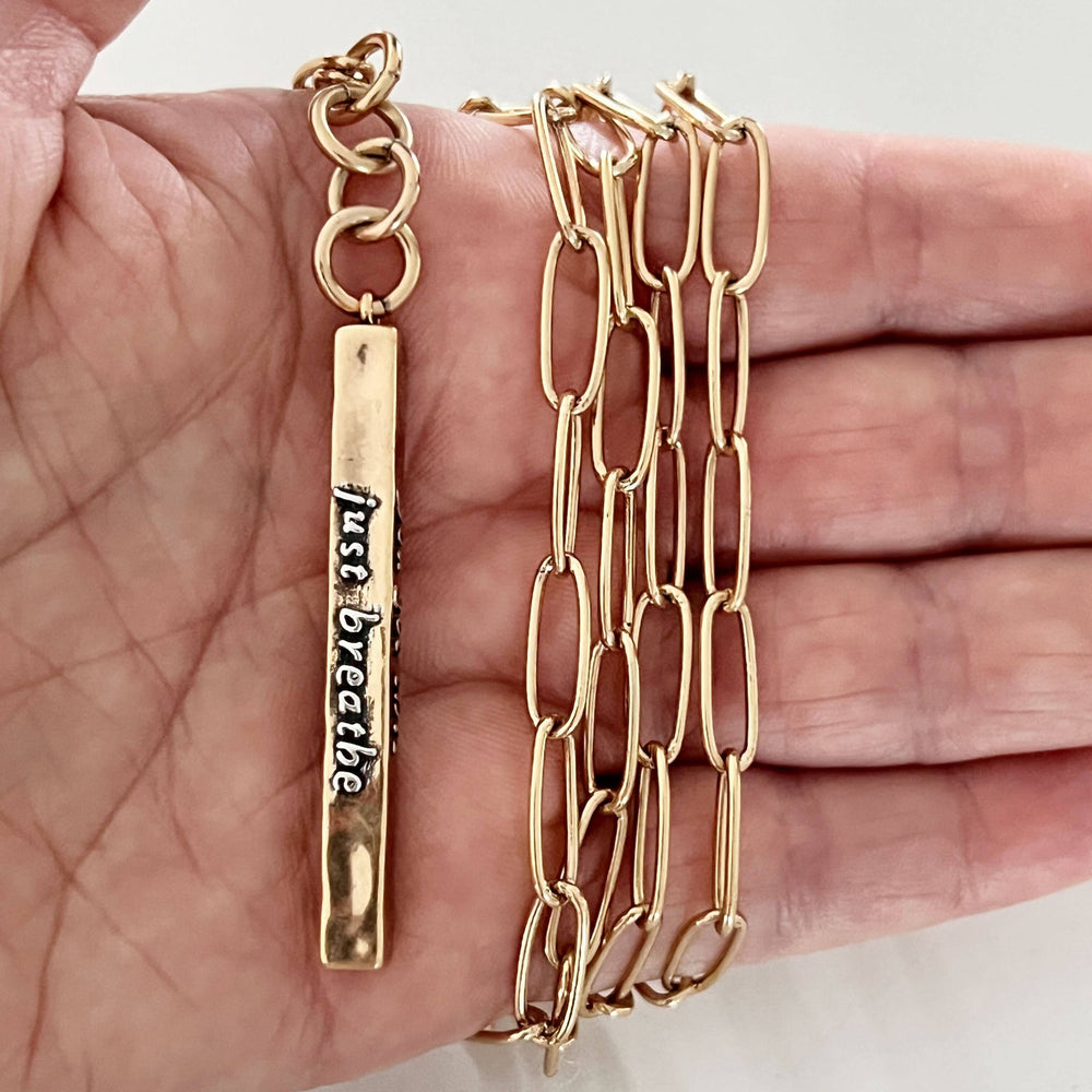 Discover the Stay Calm necklace by Klink, an ideal blend of style and inspiration. Featuring a 46" plated paperclip chain available in gold, silver, or gunmetal finishes, this necklace is both elegant and empowering.
