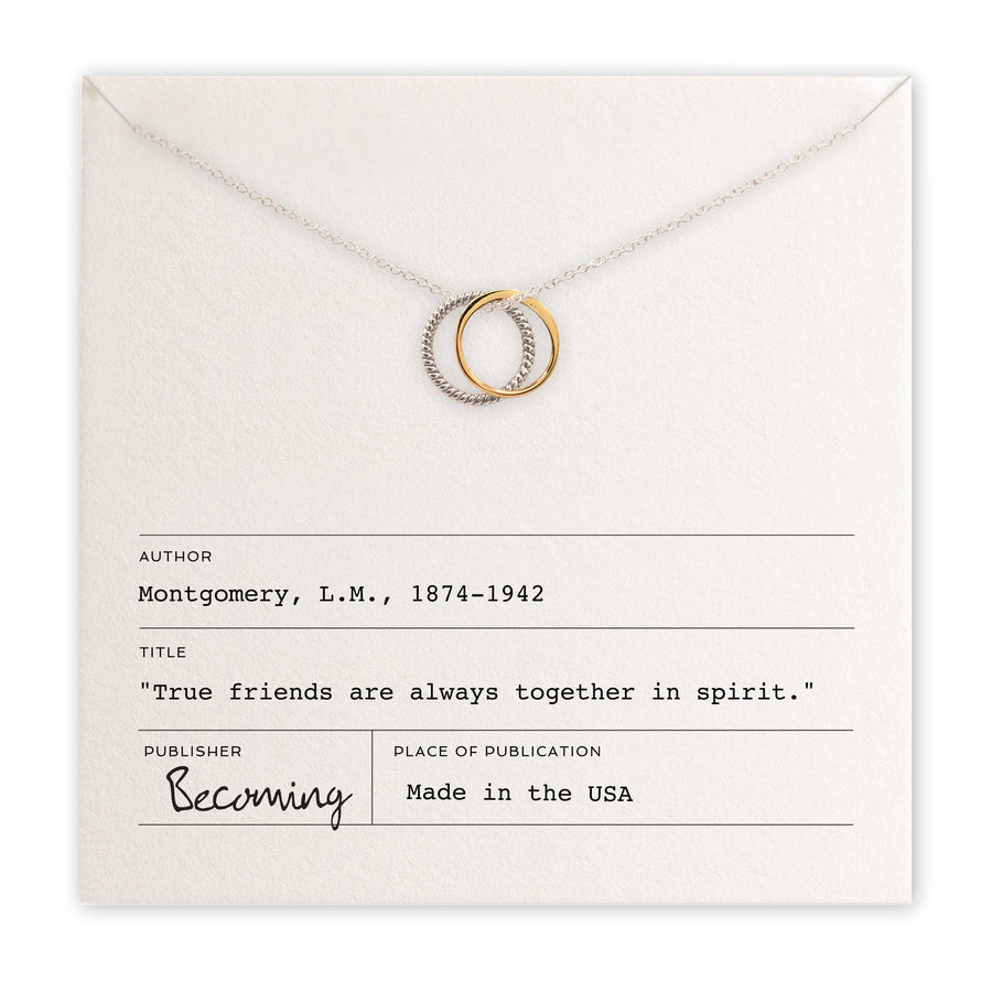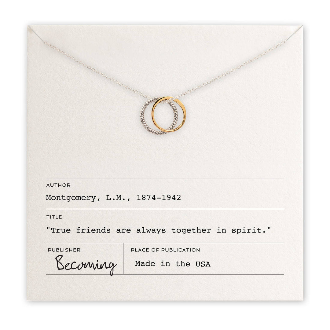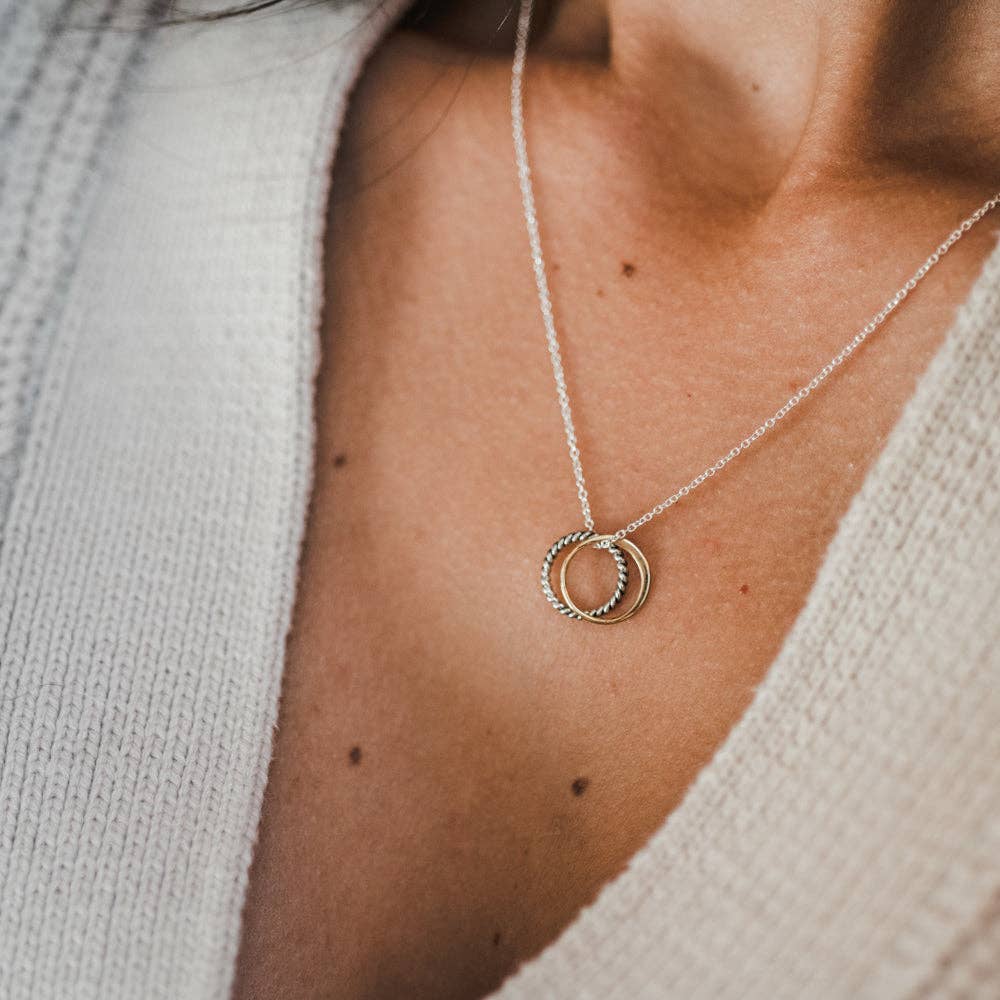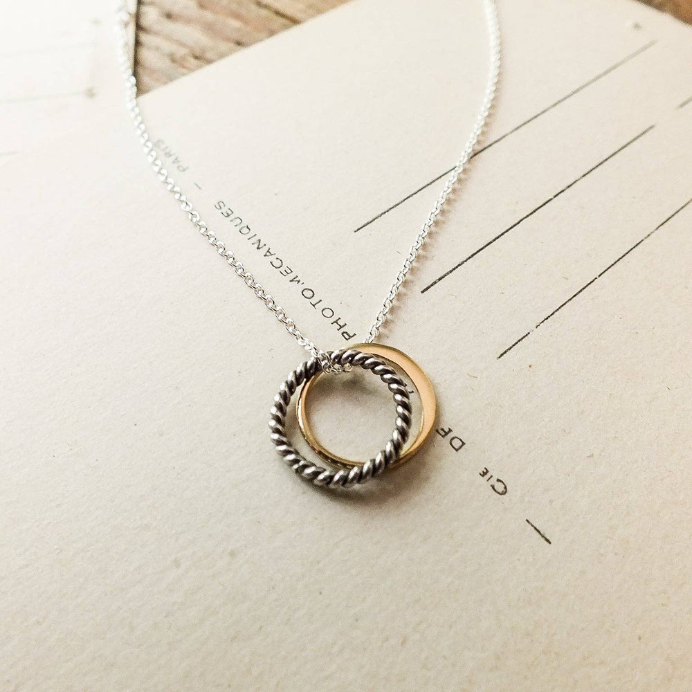 * two circles measure 1/2" wide * one silver and one gold circle on sterling silver chain * on 18" sterling fine cable chain * all necklaces are packaged on the message card shown, in our logo jewelry box