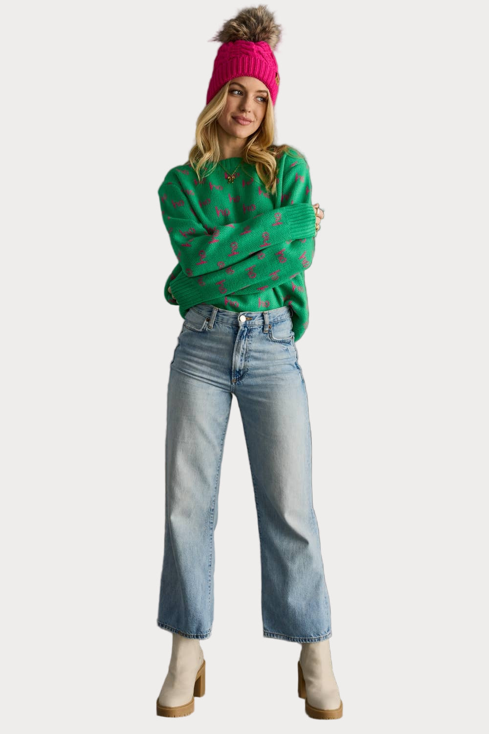Bring on the holiday cheer with this playful Green Ho Ho Ho Sweater. Featuring a bright green knit covered in cheerful pink lettering, this cozy layer adds instant joy to your seasonal style. Soft, festive, and easy to wear, it pairs effortlessly with denim for a fun, spirited look all winter long.