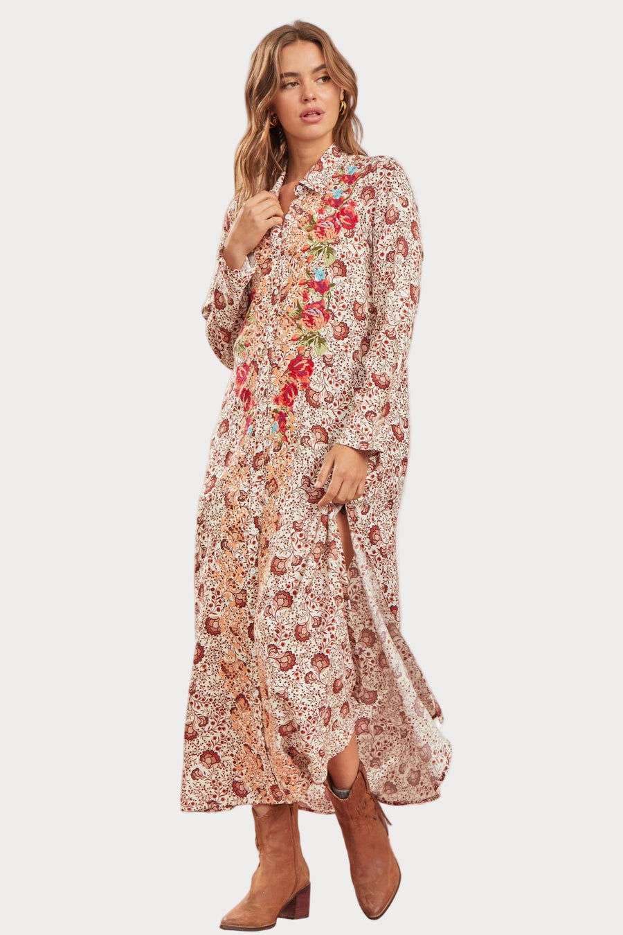 Elevate your wardrobe with the Plus | Embroidered Floral Maxi Shirtdress & Duster. Thoughtfully designed, this maxi offers effortless style with details that make it easy to dress up or down.
