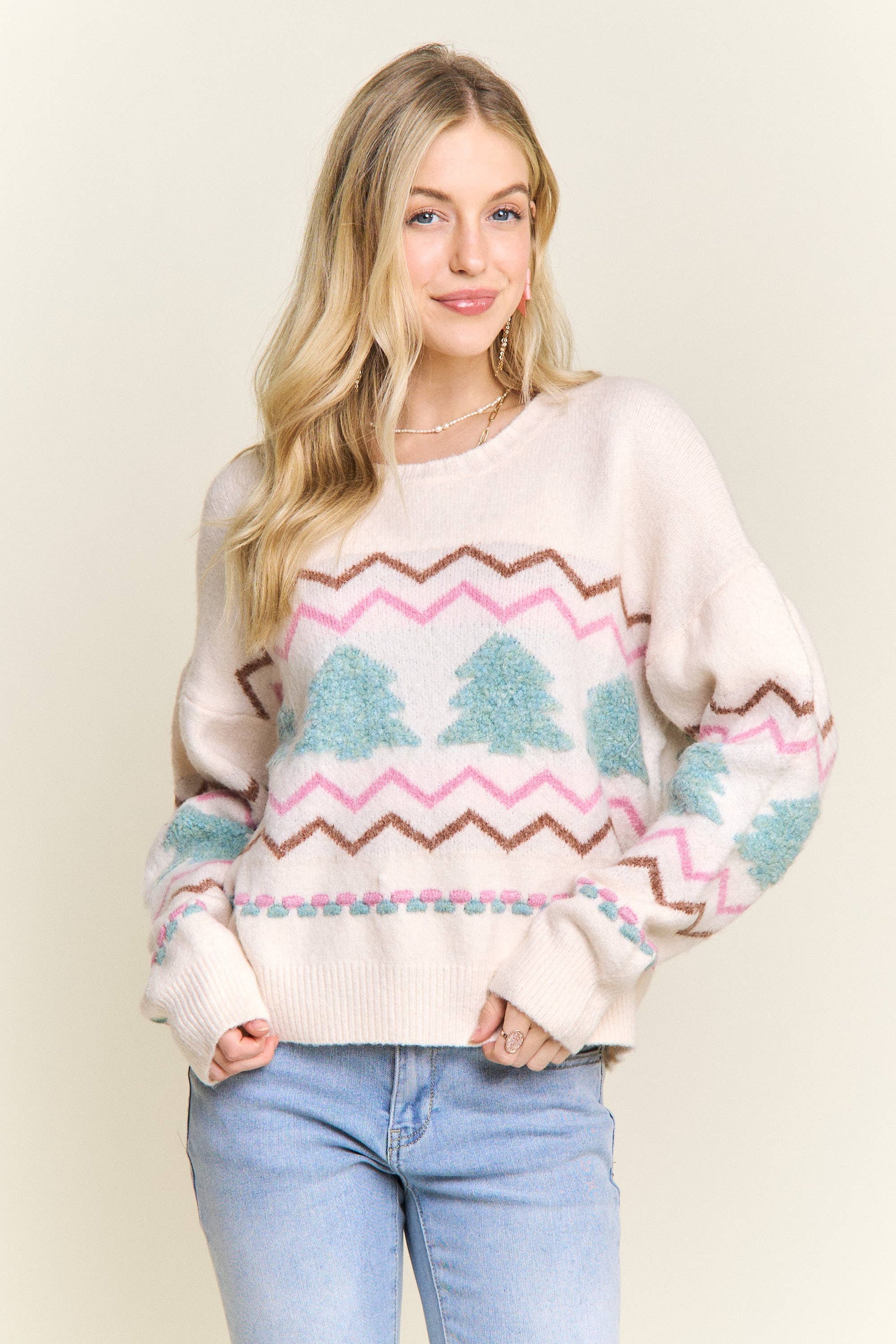 “Plus size cream knit sweater with fluffy textured Christmas trees and pastel chevron stripes”
