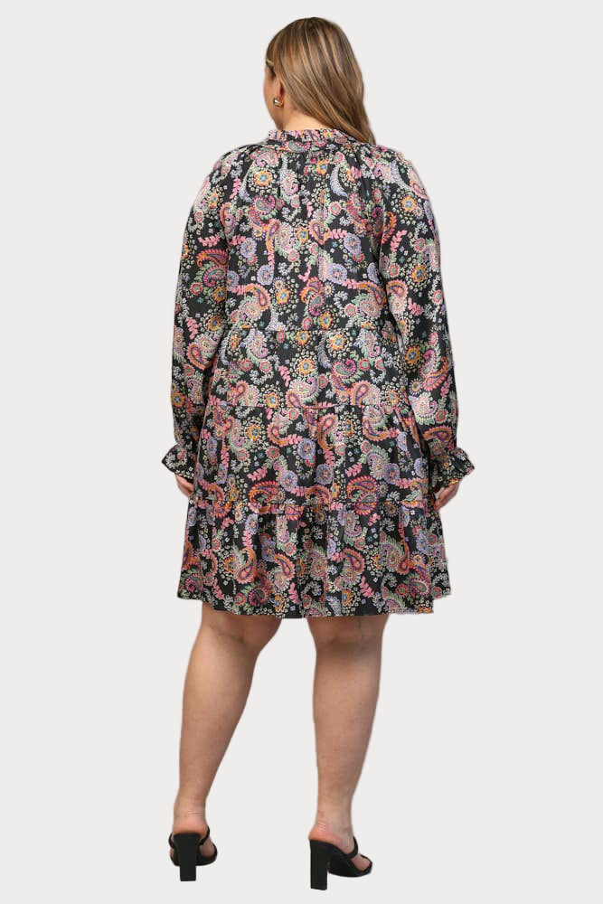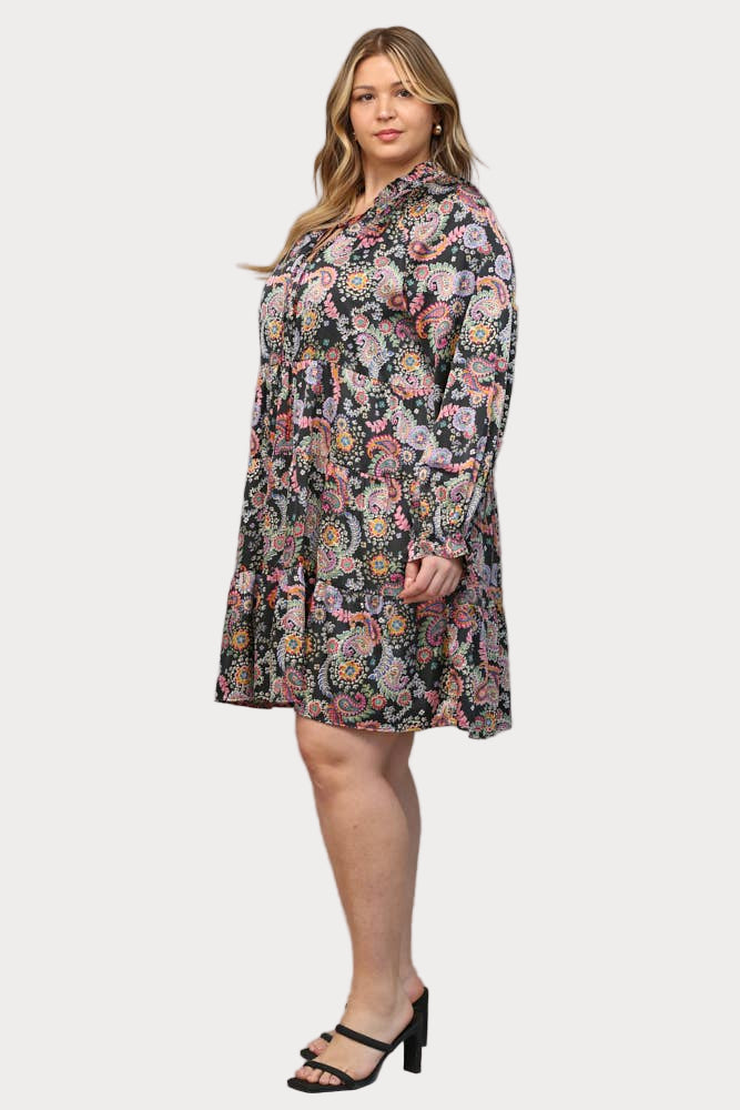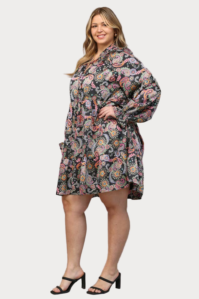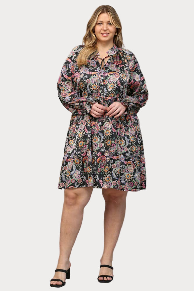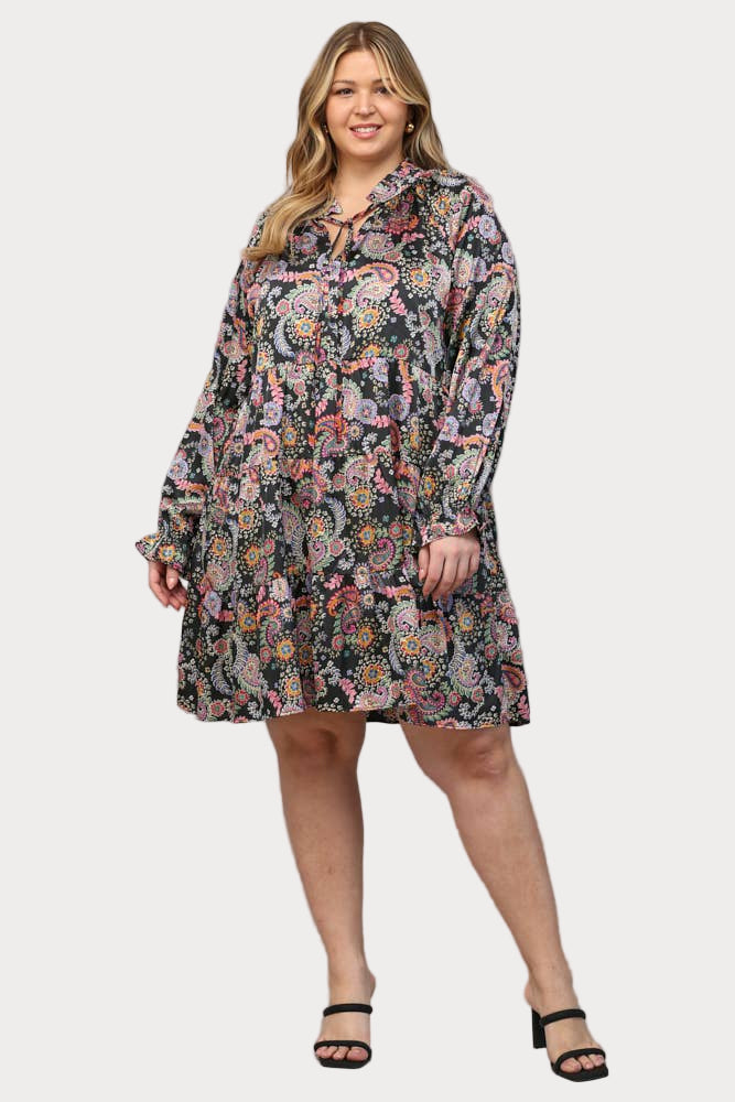A plus-size model stands against a light neutral background wearing a long-sleeve, knee-length tiered dress in a black satin fabric with a colorful all-over paisley print. The dress features a tie-neck collar and she is wearing black open-toed heels.