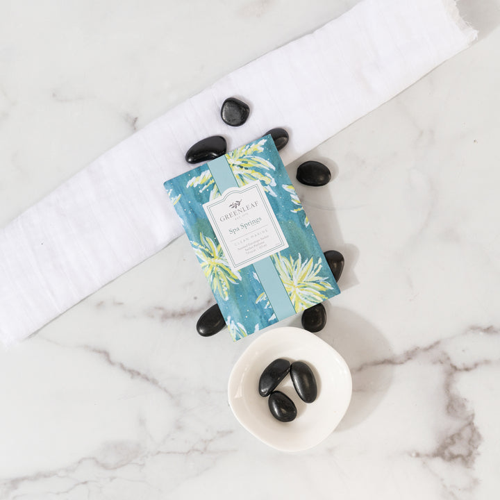Transform any space with the enchanting aroma of Greenleaf's Large Sachets in Spa Springs. Crafted by expert perfumers, this fragrance captures the serene essence of dancing palm trees and gentle breezes, providing a refreshing and clean experience.