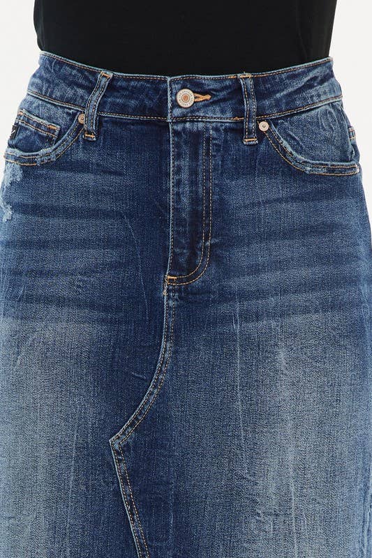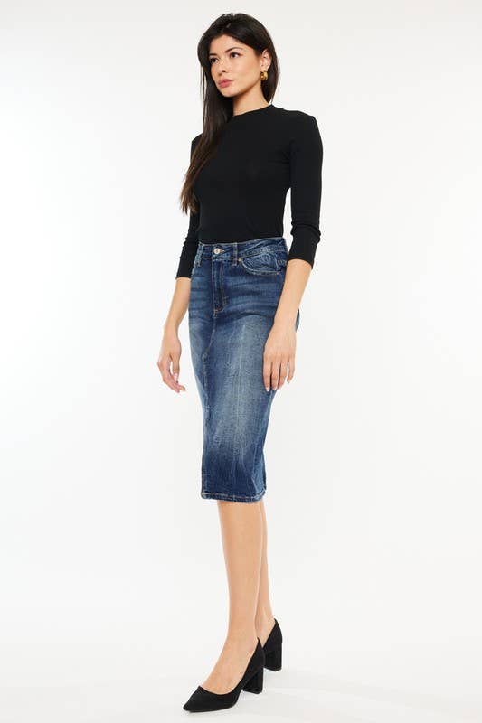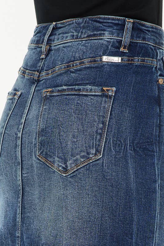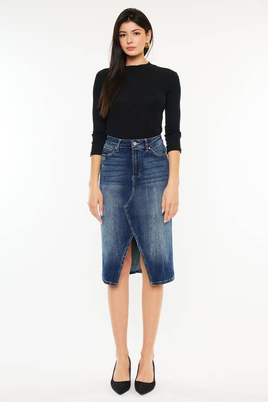 This dark wash, high rise midi skirt features a unique slit detail and white pocket lining for added style. Made of a high-quality 99.2% cotton and 0.8% spandex blend, this skirt provides a great fit and construction.