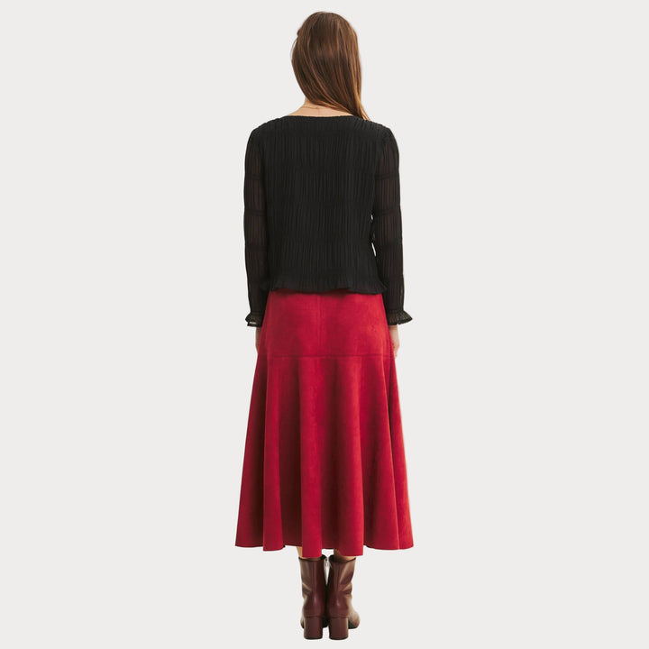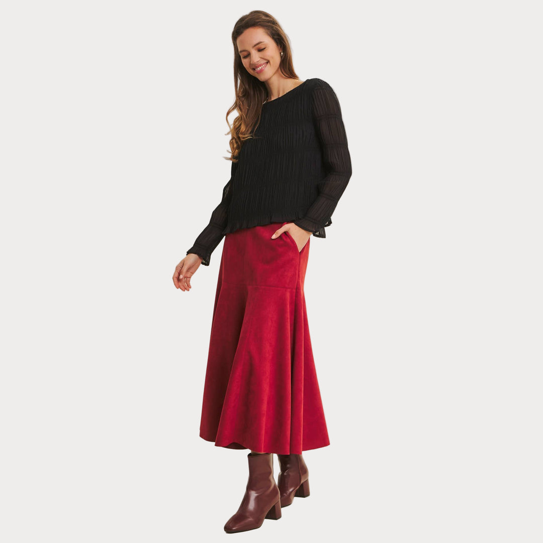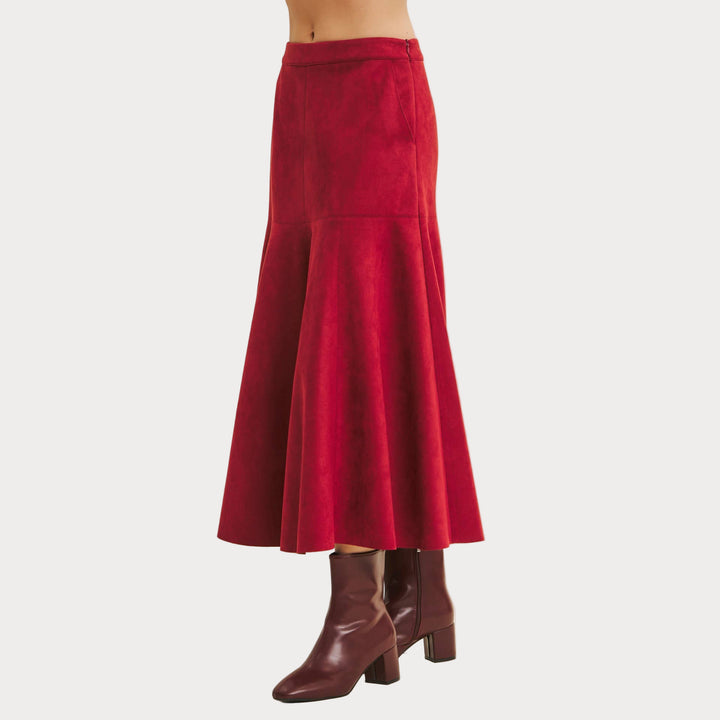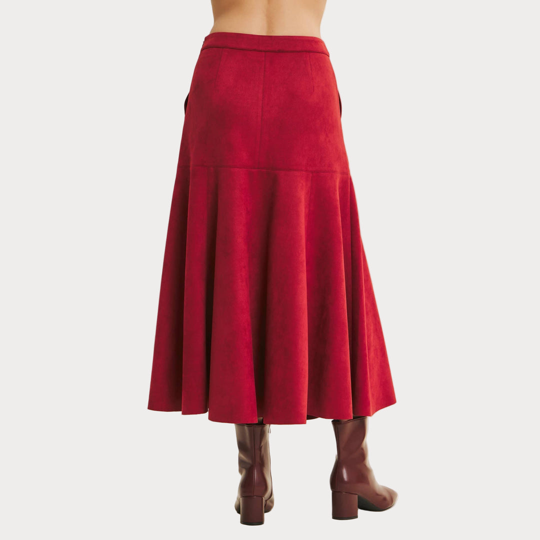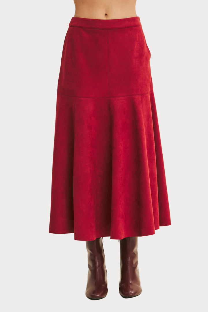 Designed to move with quiet grace, this paneled A-line skirt is crafted from soft, vegan suede that feels just as luxurious as it looks—without compromise. The midi length and subtle flare lend an elegant drape, while tailored paneling adds gentle structure and dimension. Featuring functional side pockets, it’s as practical as it is romantic. Whether paired with a cozy knit or a tucked-in blouse, this skirt instantly elevates your fall wardrobe. The concealed side zipper keeps the silhouette clean, and the cruelty-free fabrication ensures you feel good—inside and out. A timeless piece with a soft heart.