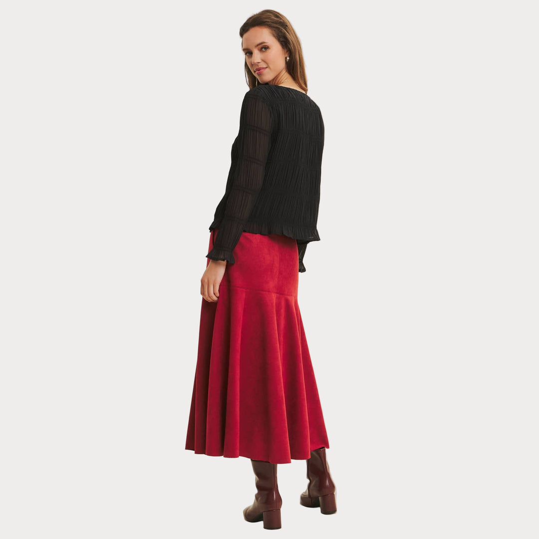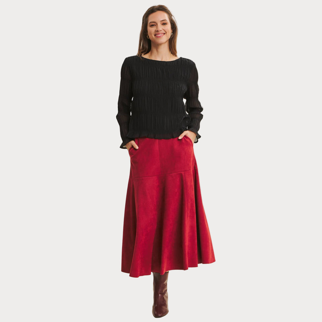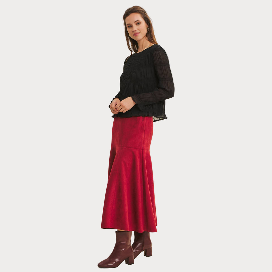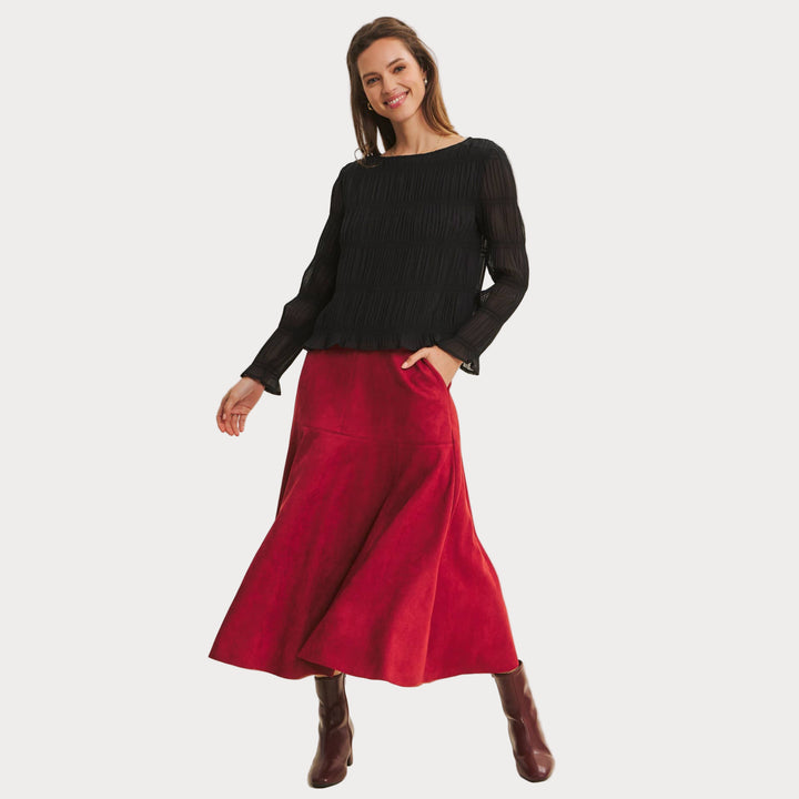 Designed to move with quiet grace, this paneled A-line skirt is crafted from soft, vegan suede that feels just as luxurious as it looks—without compromise. The midi length and subtle flare lend an elegant drape, while tailored paneling adds gentle structure and dimension. Featuring functional side pockets, it’s as practical as it is romantic. Whether paired with a cozy knit or a tucked-in blouse, this skirt instantly elevates your fall wardrobe. The concealed side zipper keeps the silhouette clean, and the cruelty-free fabrication ensures you feel good—inside and out. A timeless piece with a soft heart.