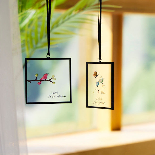 Transform any room into a serene sanctuary with the Love From Above Suncatcher by artist Sharon Nowlan. Inspired by the landscapes of Nova Scotia, this unique piece features a mix of composite pebbles and other materials, capturing the beauty and emotion of relationships. A must-have for any art lover.
