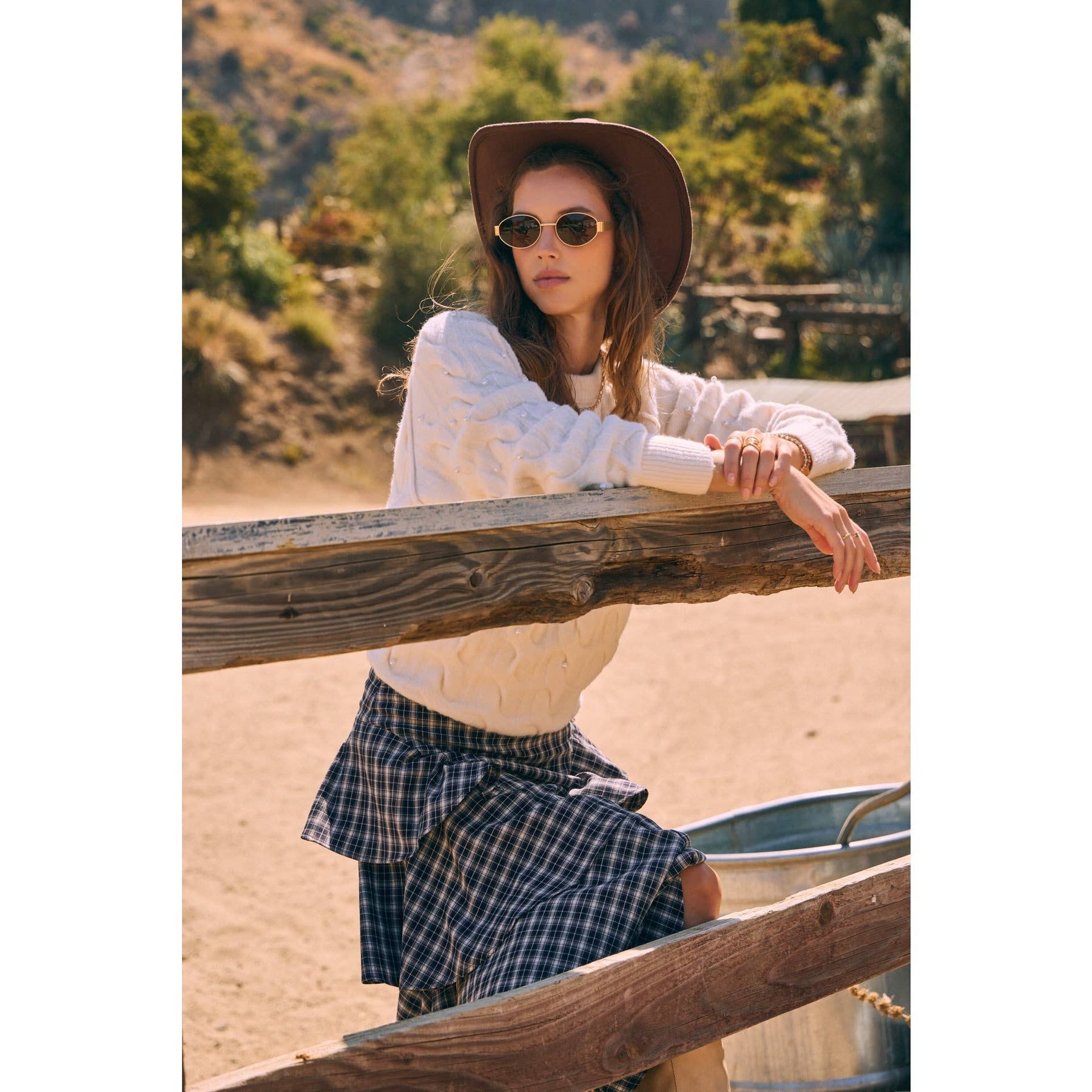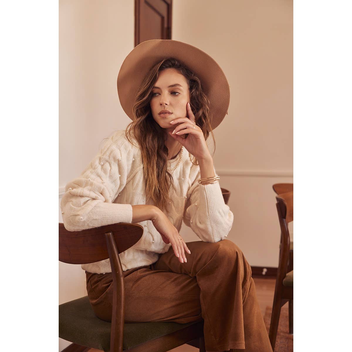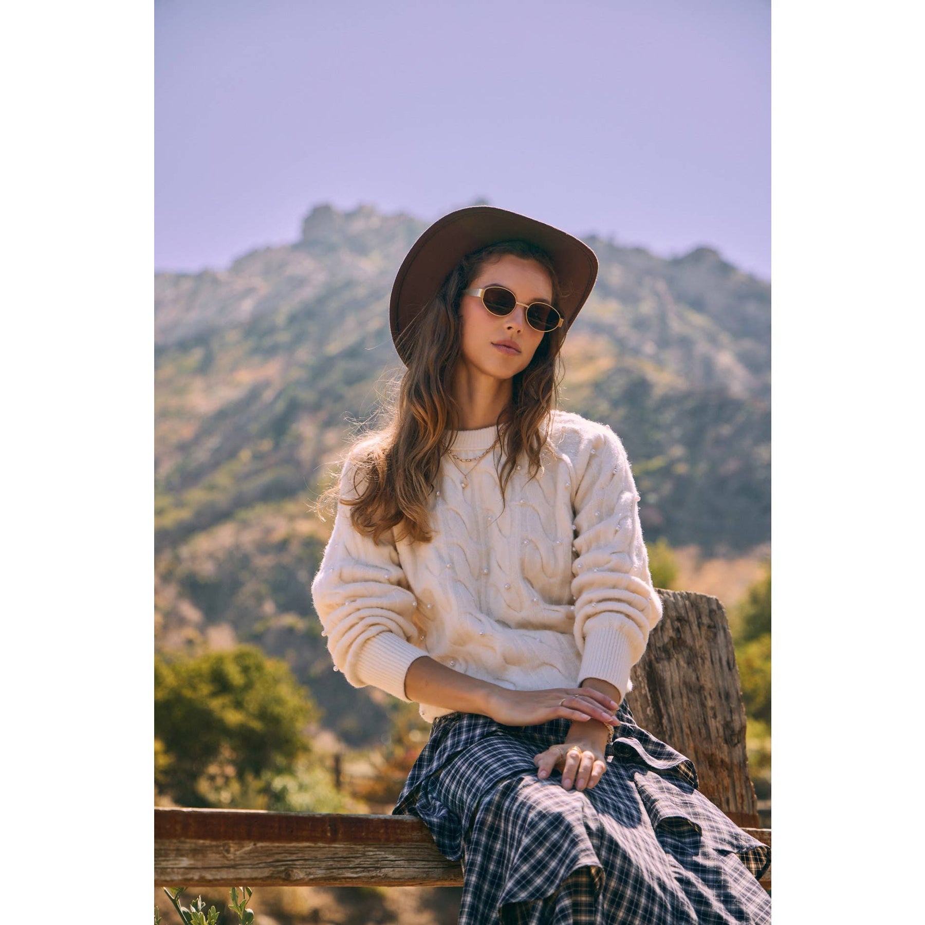 The classic cable knit design is elevated with delicate pearl embellishments for subtle sophistication. Its relaxed tunic length makes it perfect for pairing with skirts, trousers, or layered over dresses. A versatile piece that blends cozy comfort with refined style.