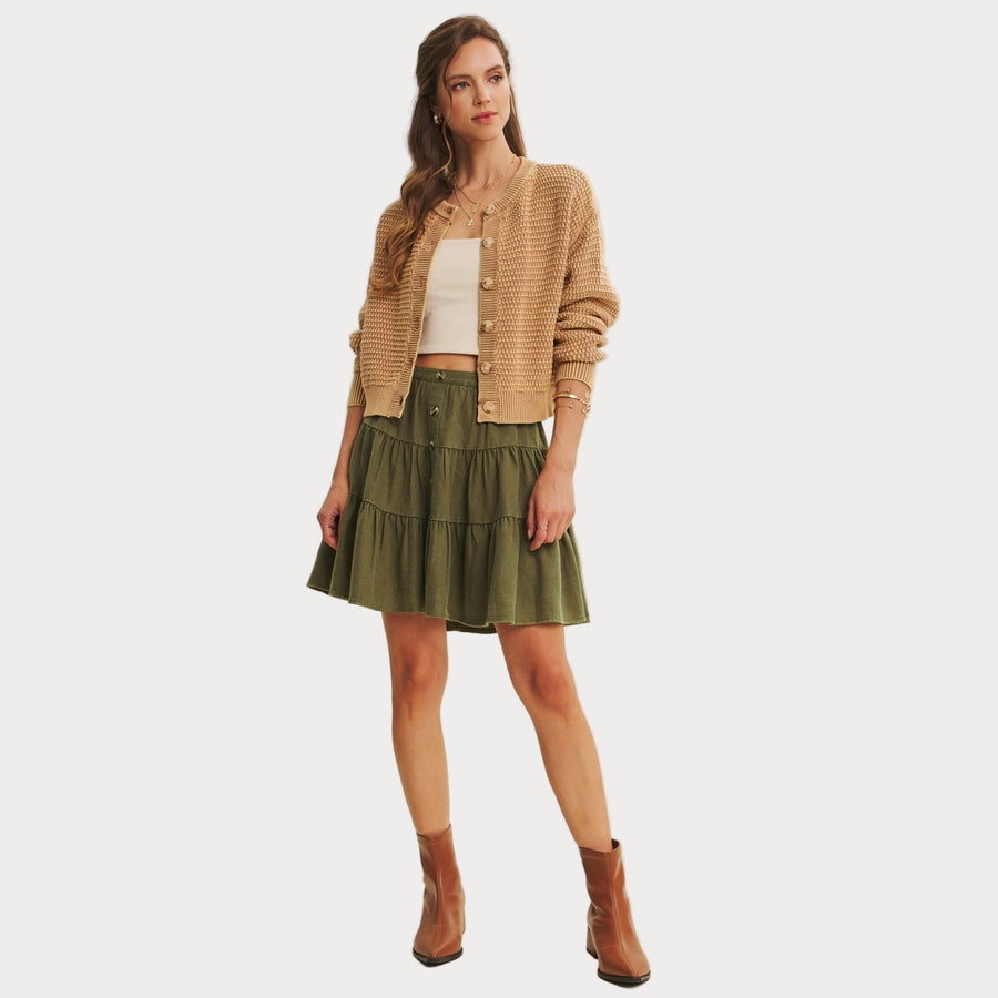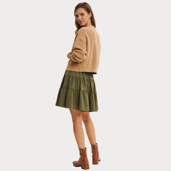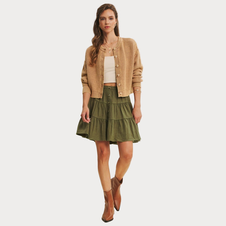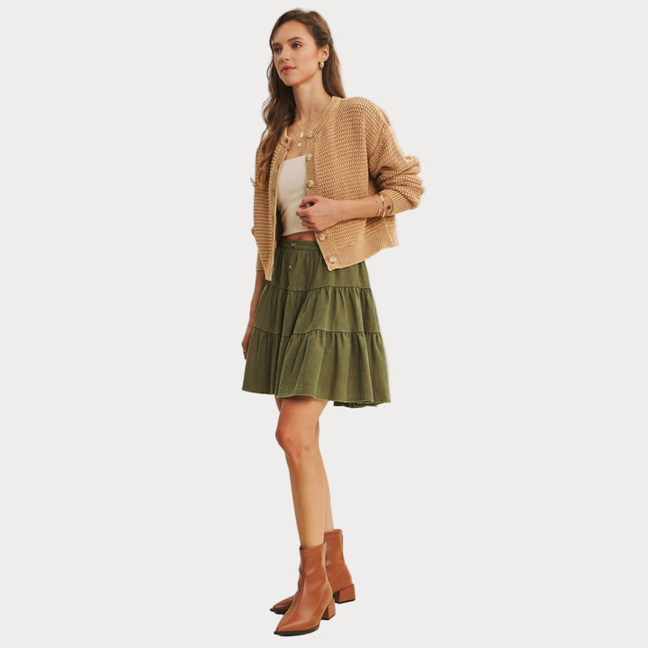 Woman wearing a beige cardigan, white top, green skirt, and brown boots on a plain background