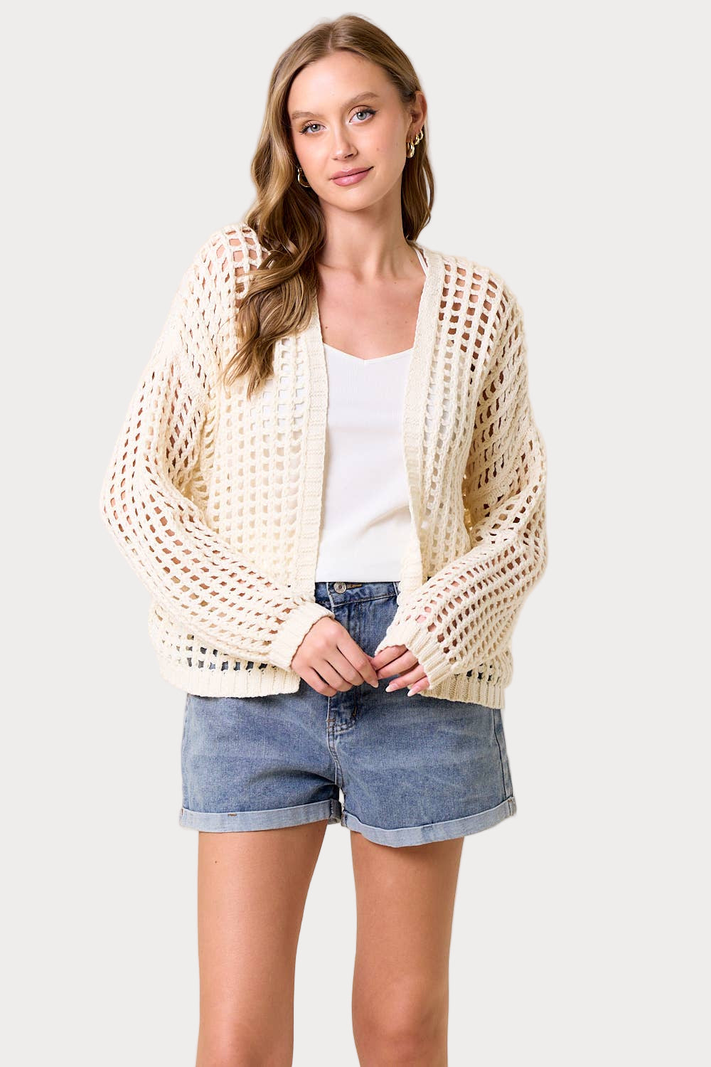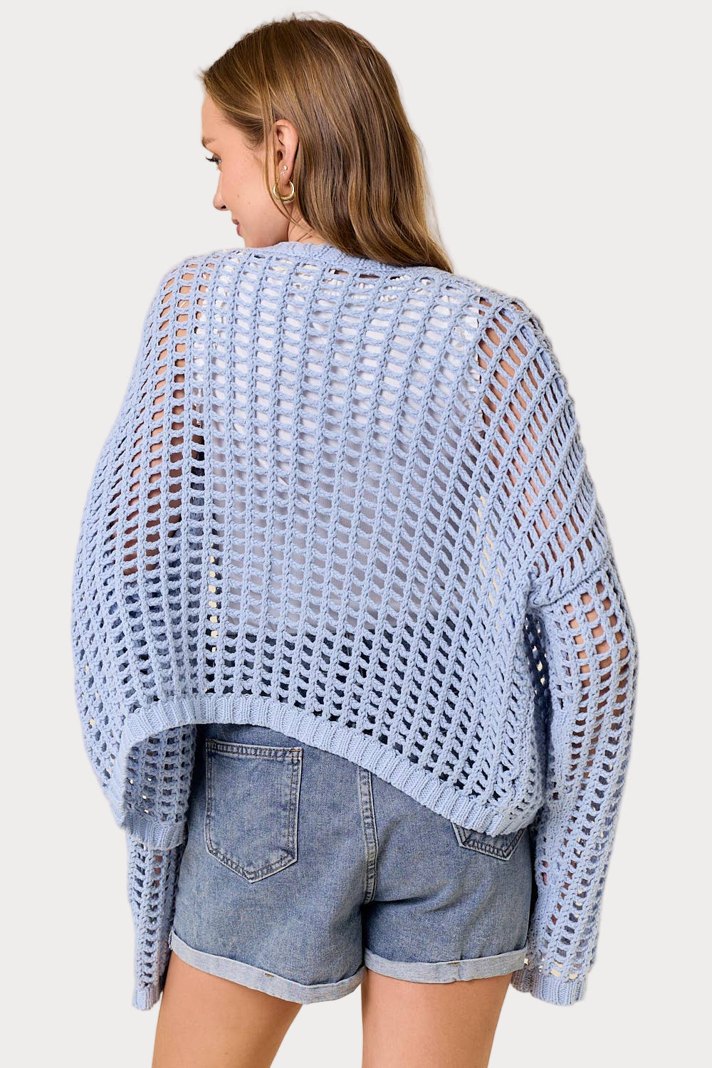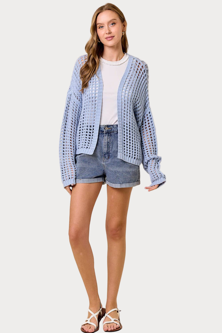 Woman wearing a light blue cardigan over a white shirt and denim shorts on a white background