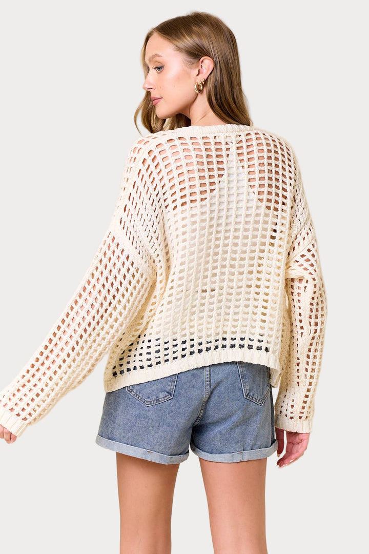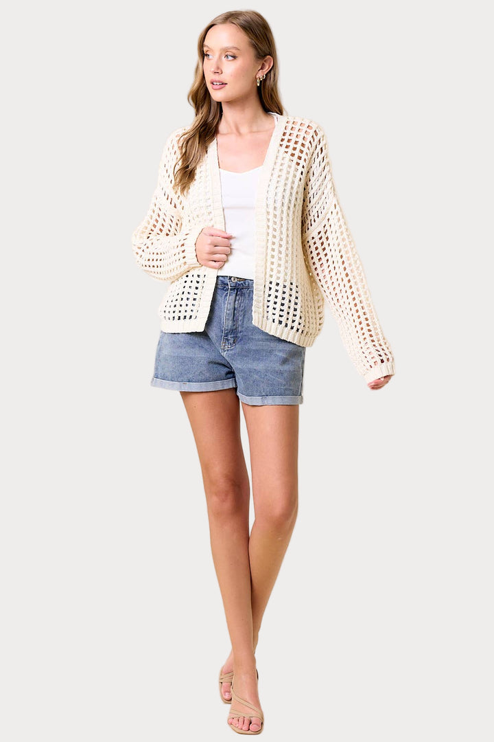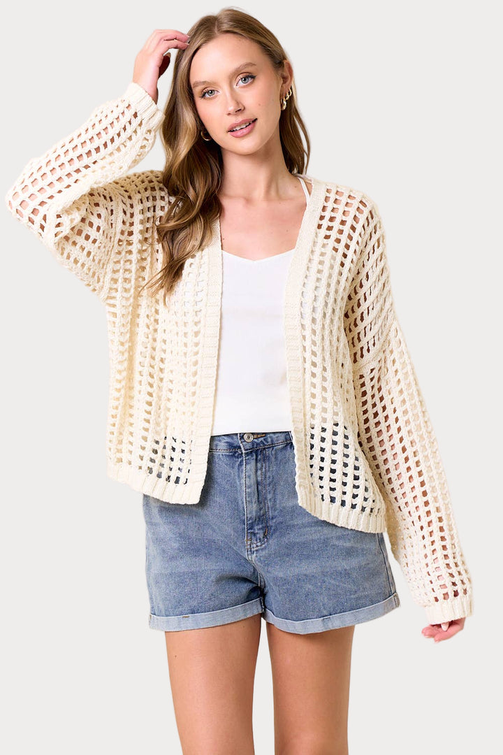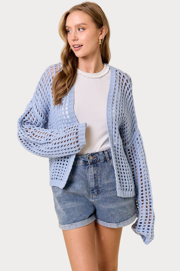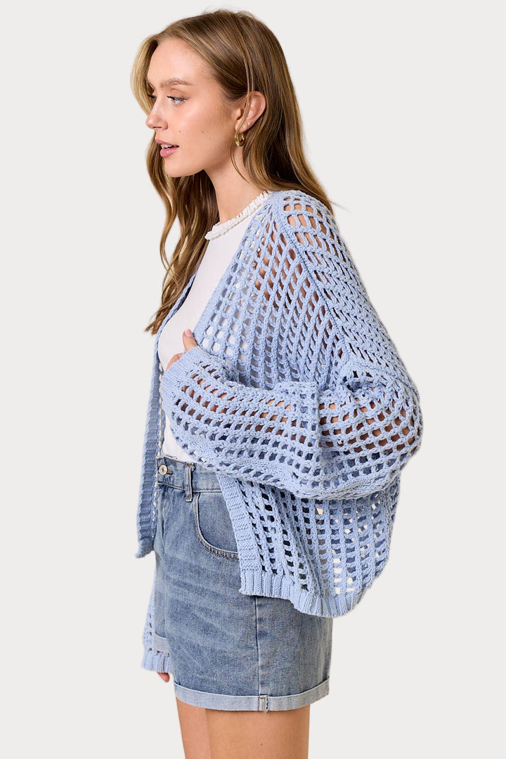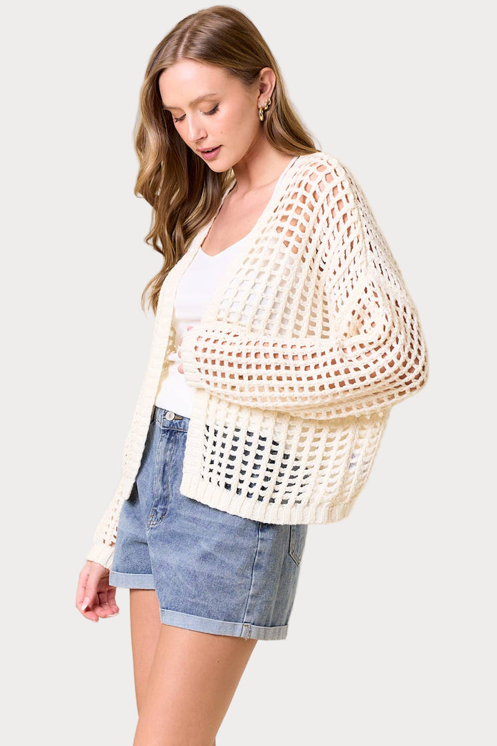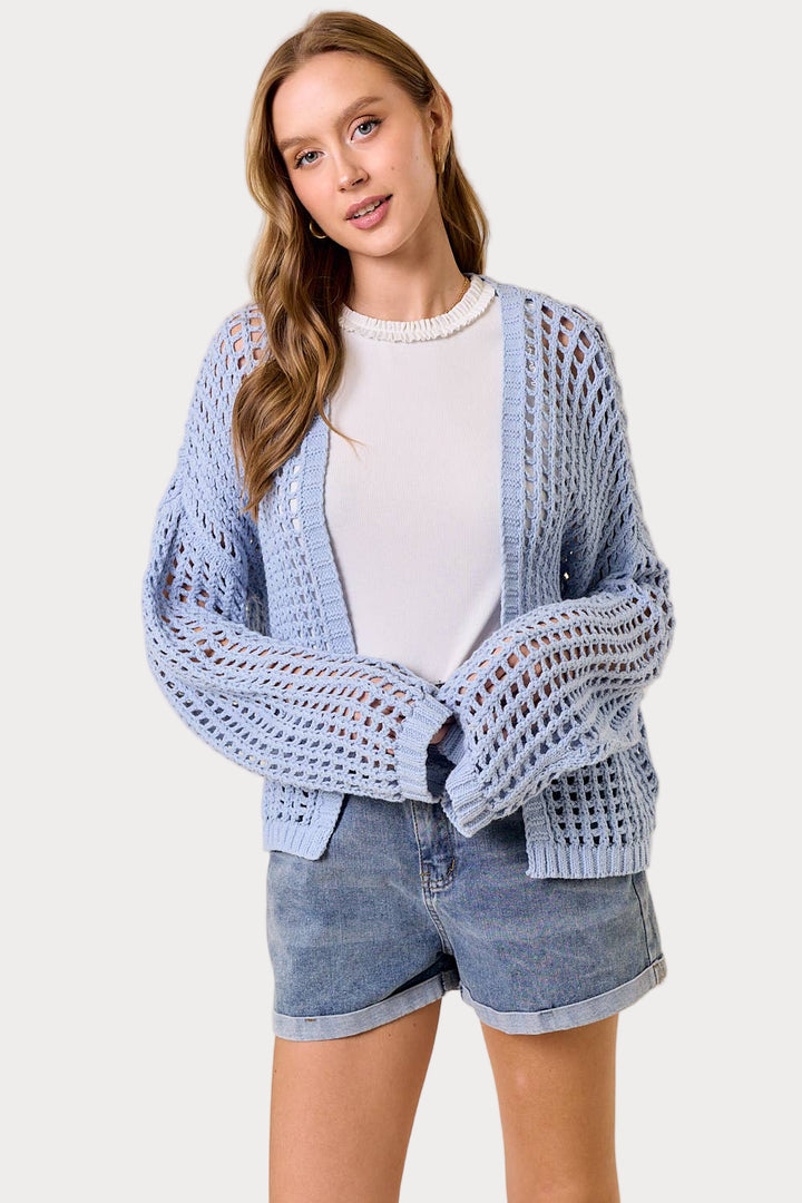 Reel in some compliments with this playful cardigan! The open-knit crochet design features a trendy fishnet pattern, while the oversized fit and long balloon sleeves add a carefree vibe. Perfect for layering or as a statement piece, this cropped cardigan will have you hooked!