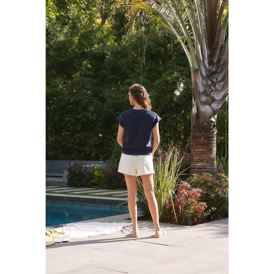 Woman wearing a navy blue top with white flower patterns and a white skirt, holding a woven bag.