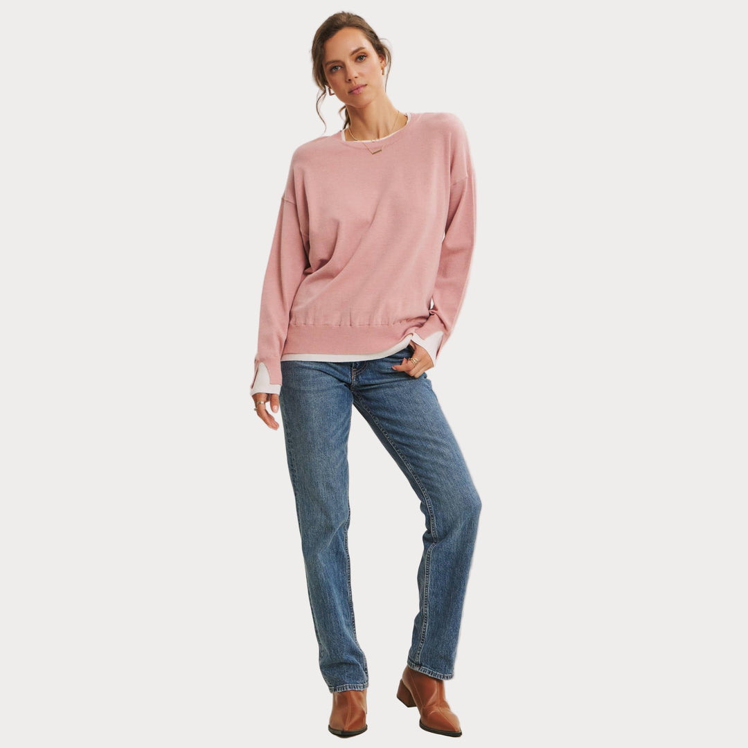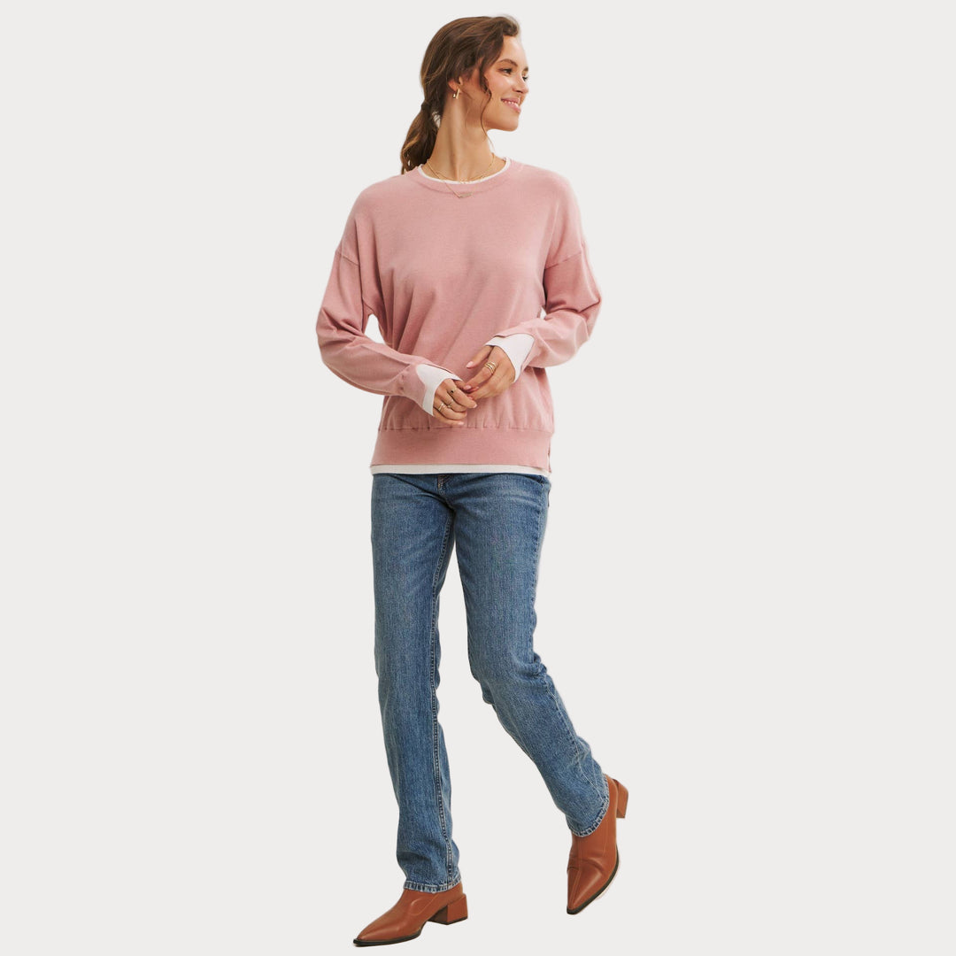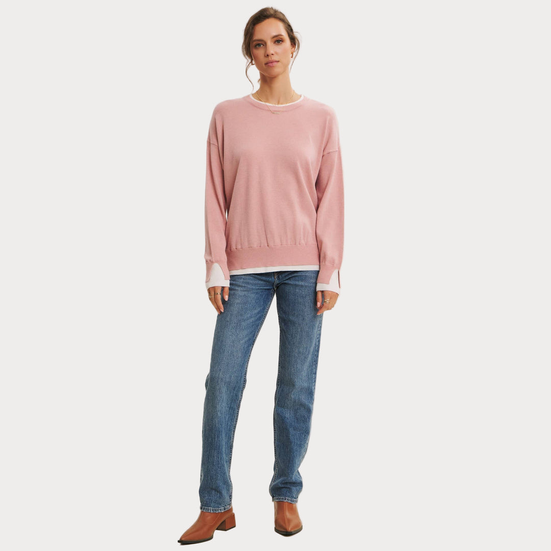 The two-tone detail at the neckline and cuffs adds a touch of modern contrast, making this piece easy to style with denim, skirts, or trousers. Lightweight yet cozy, it’s the sweater you’ll reach for season after season.